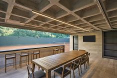 A implantação reforça essa vocação. Todas as unidades são posicionadas para aproveitar ao máximo a paisagem montanhosa, e a fachada curva abre o campo visual conforme o morador se desloca pelos ambientes. O resultado é uma experiência de moradia que se desenrola em camadas — ora horizontalmente, ora verticalmente — sempre conectada à vista e ao ciclo solar. Mezaninos, terraços, janelas profundas e vazios internos não funcionam como adições isoladas, mas como parte de uma estratégia arquitetônica que busca ampliar a vida cotidiana.