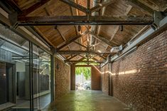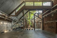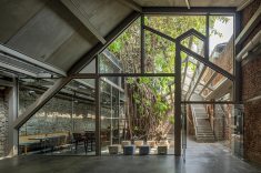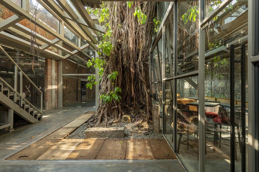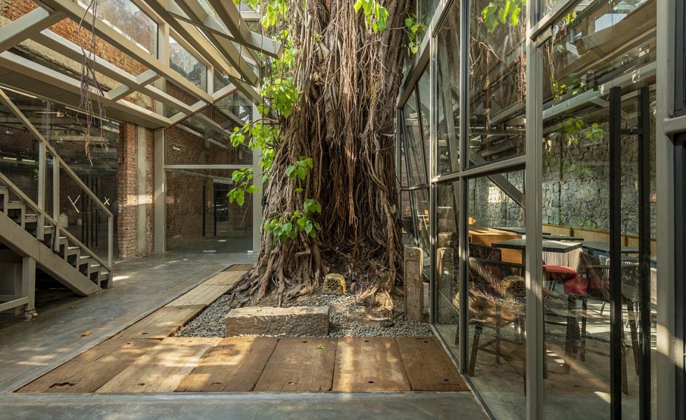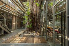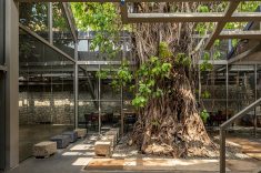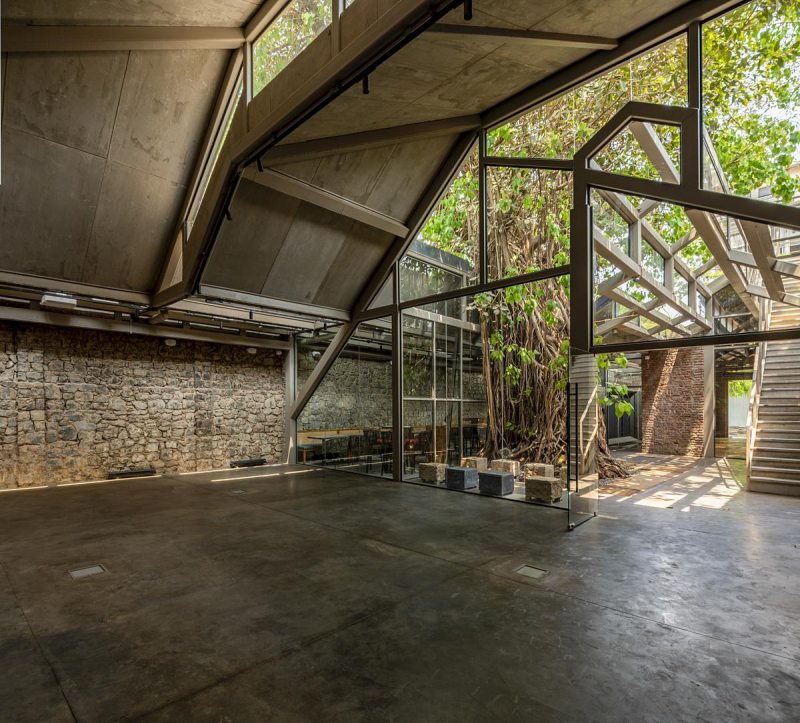 coração histórico de Mumbai, a antiga Fábrica de Gelo Ambico, com 140 anos, foi restaurada e transformada em um espaço cultural que une arte, design e convivência. Localizada em Ballard Estate, área marcada pela arquitetura colonial britânica e pelo comércio portuário, a construção de 1 mil m² havia sofrido décadas de abandono e alterações improvisadas. A restauração do conjunto devolveu à cidade um patrimônio degradado, respeitando sua estrutura original e a árvore monumental que sempre esteve em seu centro — uma figueira-de-bengala (Ficus benghalensis), espécie nativa da Índia conhecida por suas raízes aéreas e copa extensa, que pode se expandir por centenas de metros.