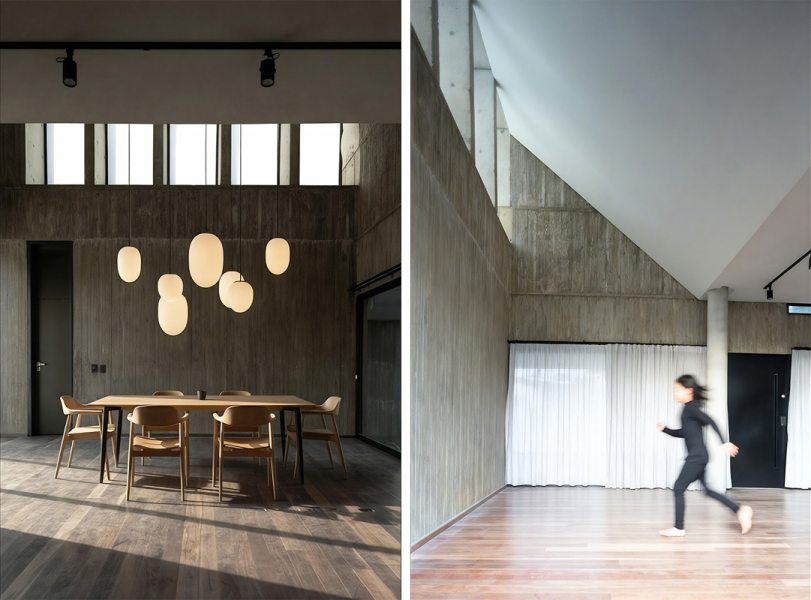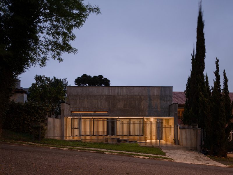 Na Casa Angélica, em um lote urbano em Curitiba, a arquitetura opera através de dualidades. A volumetria frontal é definida por uma membrana externa de concreto cru em que a textura ripada aparenta uma armadura invulnerável voltada para a rua. Esta dureza externa, no entanto, é o que garante a preservação de um interior etéreo e fluido.