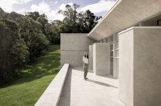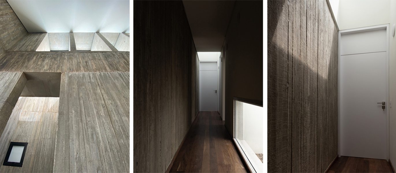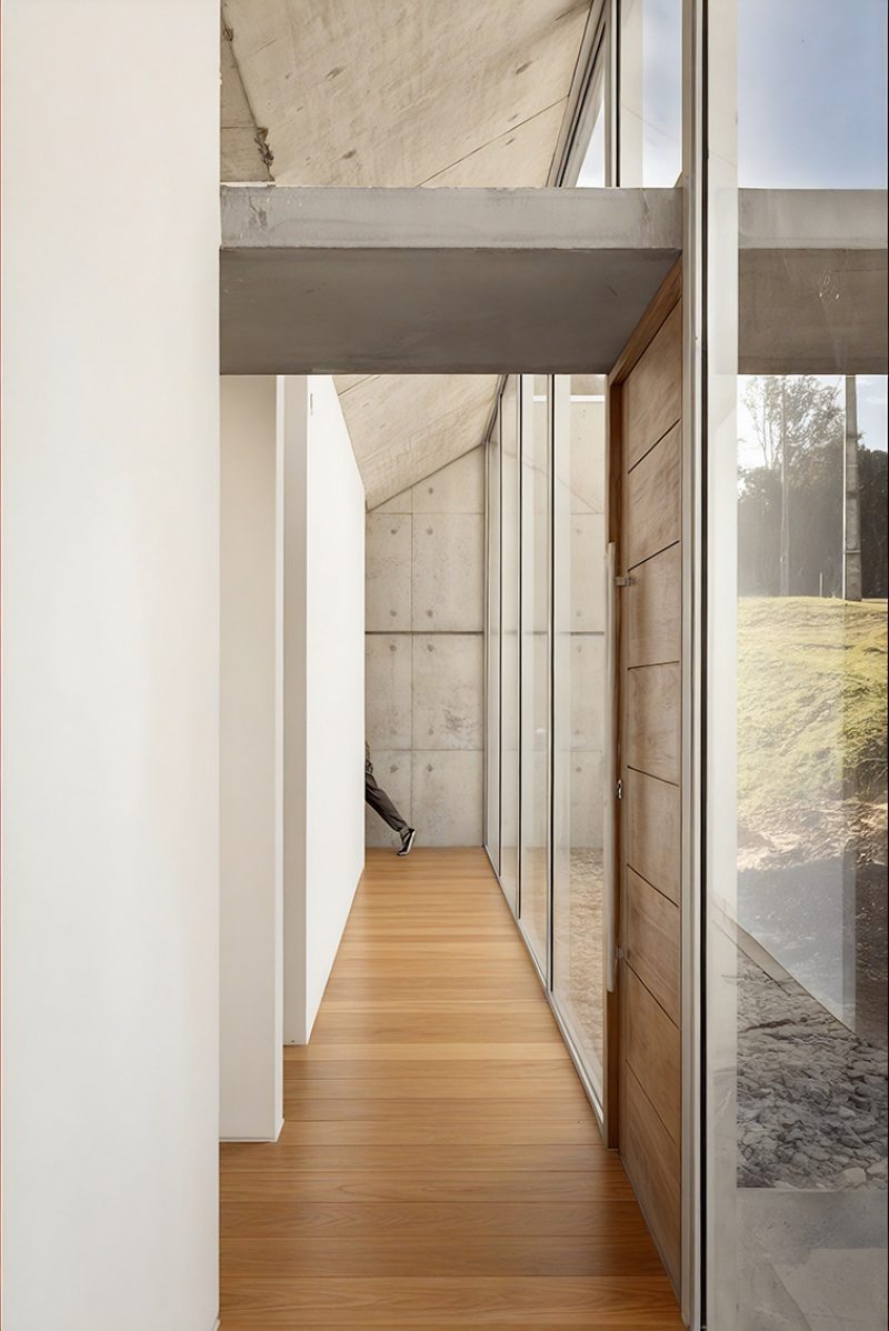 A circulação longitudinal, concebida como uma galeria envidraçada, organiza a fachada frontal. O percurso interno é marcado pela escada sob cobertura zenital e pérgolas de concreto, e atua como um elemento articulador entre os pavimentos. Ao descer, a visão da mata é gradualmente revelada até culminar em um vão panorâmico que se estende por toda área social, com pé-direito alto e vigas invertidas para maximizar a amplitude espacial através da laje em concreto aparente, plana e contínua. As empenas laterais em concreto aparente não apenas garantem a privacidade em relação aos vizinhos, mas delimitam o gesto horizontal que orienta toda a implantação.