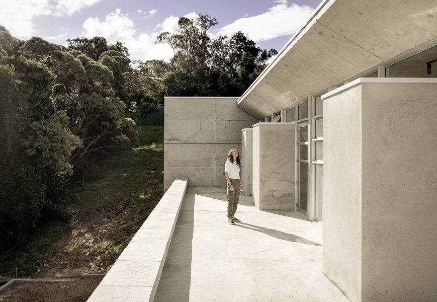 Projetada para um terreno com declive acentuado voltado para uma área de preservação, a residência inverte a lógica convencional: a área íntima ocupa o pavimento superior, no nível da rua, enquanto o setor social se distribui na cota inferior, em contato direto com o jardim dos fundos e o bosque.