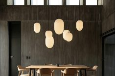 O coração da residência é o setor social, onde o pé-direito com até 5 metros de altura, se dobra em uma solução geométrica triangular para capturar a luz zenital do Norte, filtrada e difusa sobre a sala de jantar. A transição para a área íntima é um exercício de manipulação sensorial: o usuário desce três degraus para um volume branco e purista, posicionado em uma cota inferior.