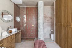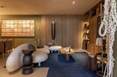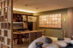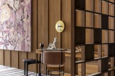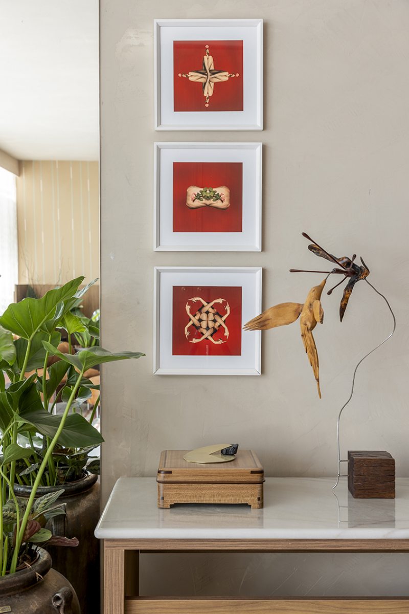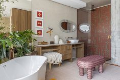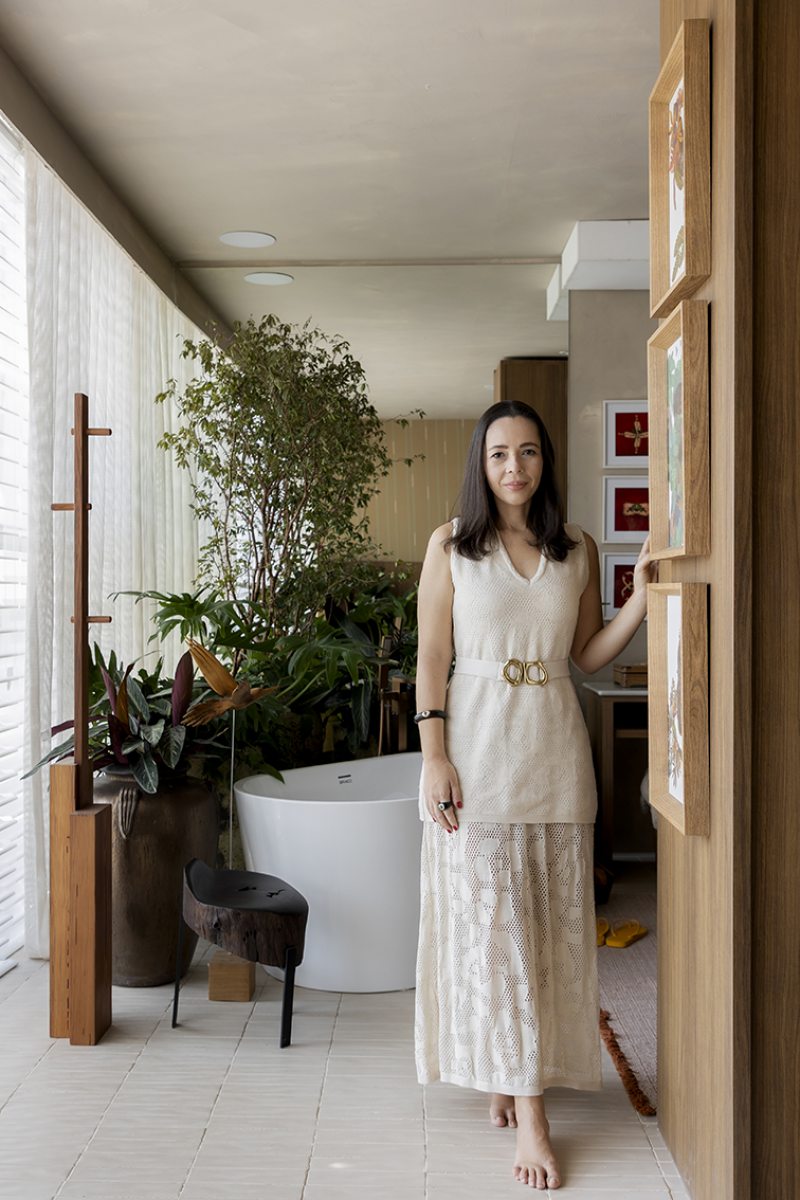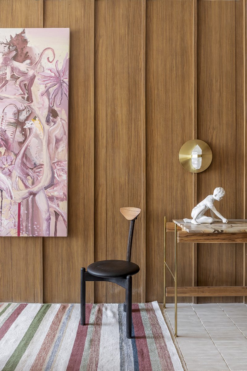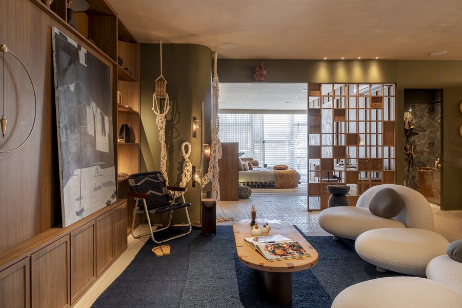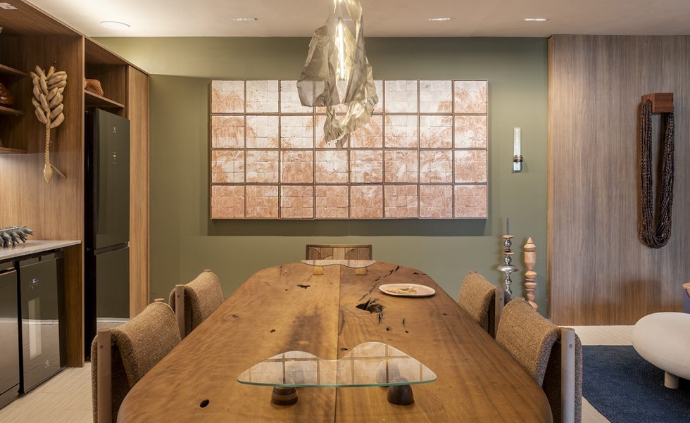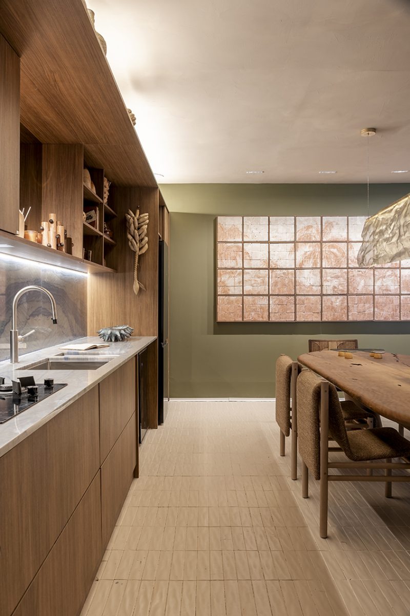 Desenvolvida para um imóvel em São Paulo, a Casa Corcovado parte da ideia de transportar essa atmosfera carioca para outro contexto urbano. O projeto acentua referências simbólicas da paisagem do Rio — especialmente a relação entre mar e floresta. A proposta também nasce de uma história específica: o ambiente foi concebido como uma homenagem a Laís e Vinícius, cariocas que hoje vivem fora da cidade natal. A arquitetura aparece, assim, como um elo entre lugares e afetos, revelando a força das referências locais mesmo quando deslocadas para novos contextos.