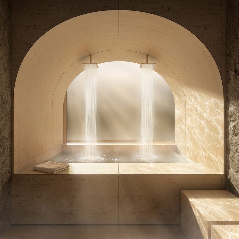 A arquitetura de interiores, assinada pelo Studio Guilherme Garcia, aprofunda o conceito ao optar por uma linguagem contida, silenciosa e sensorial. Inspirados nas materialidades de Jerusalém, os ambientes não têm poucos elementos, cuidadosamente escolhidos levando a uma experiência sensorial sutil.