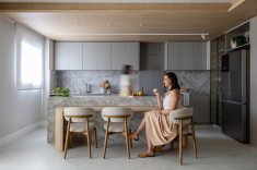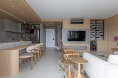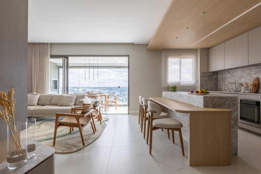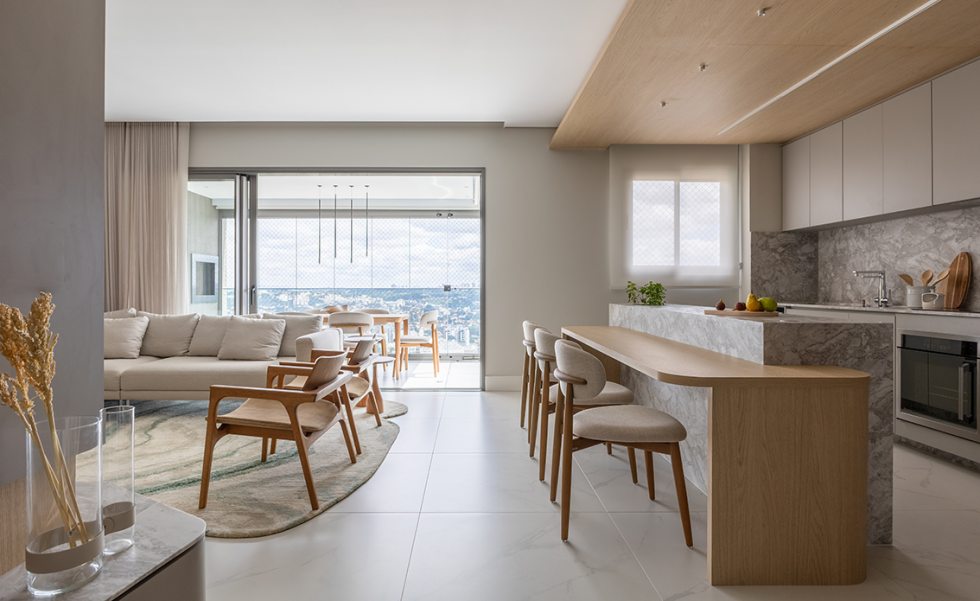 O apartamento apresentado nesta edição da Casa Sul ilustra bem esse olhar conjunto. A planta original foi reorganizada para ampliar a integração: a varanda deixou de ser um espaço apartado e passou a compor o living, abrigando a sala de jantar em uma área mais iluminada e contínua. A marcenaria sob medida com cantos arredondados e detalhes personalizados, traz unidade visual e suaviza as transições entre ambientes. Na cozinha, o mármore Kronos e a paleta neutra conferem protagonismo ao espaço, criando uma área funcional e elegante.