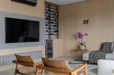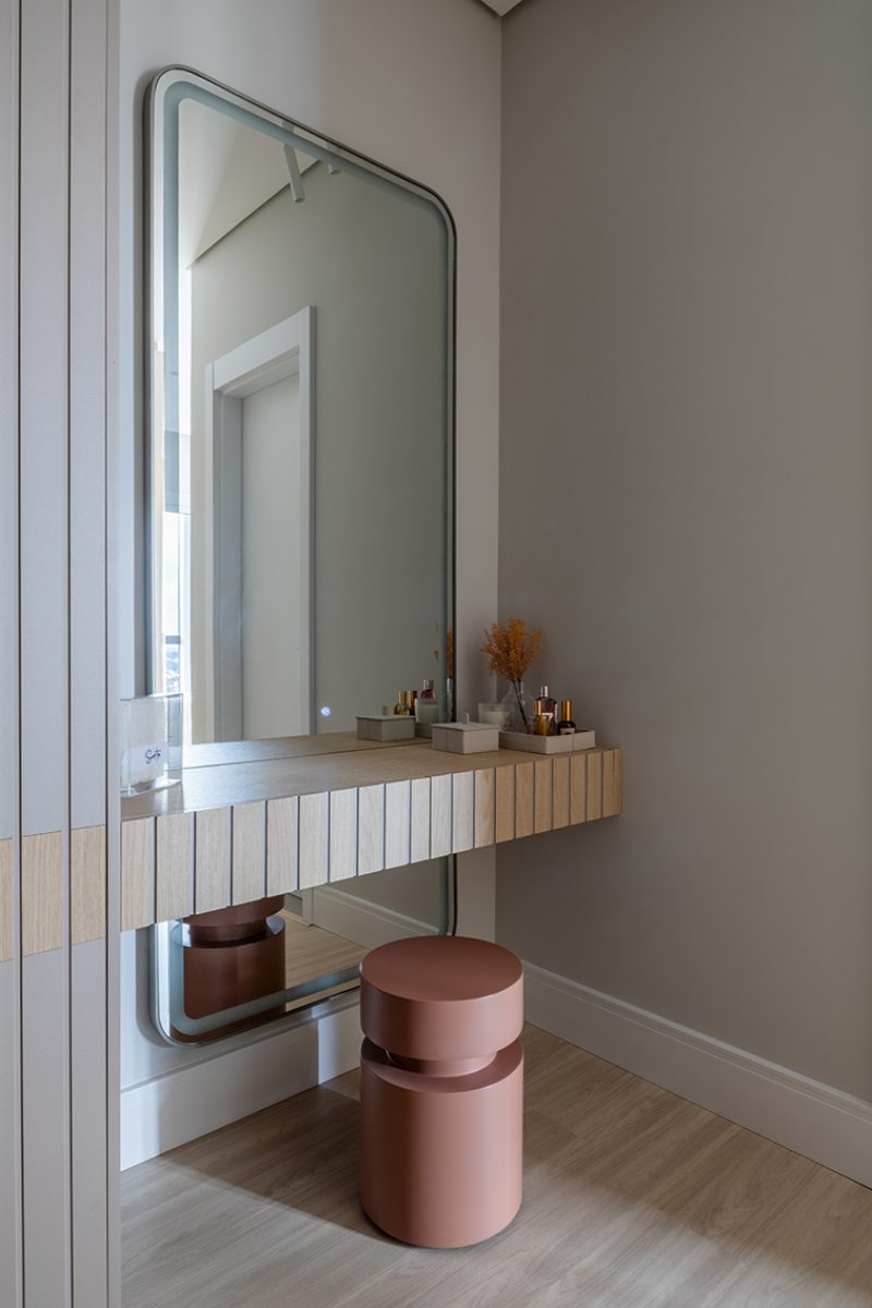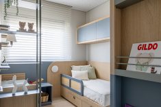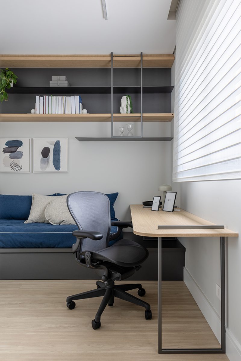 O escritório foi pensado para atender demandas múltiplas, funcionando como ambiente de trabalho, reuniões e quarto de hóspedes — um recurso cada vez mais presente nos projetos contemporâneos. Já o dormitório infantil aposta em uma abordagem lúdica e sensível: formas curvas, cores suaves e papel de parede no teto criam um ambiente que estimula a imaginação e acompanha o desenvolvimento da criança.