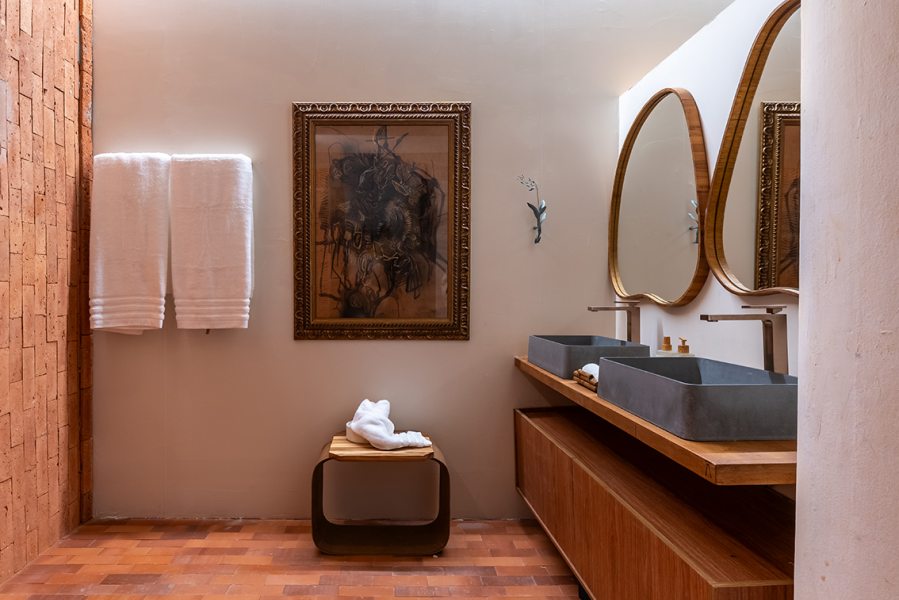 A terra compactada, por exemplo, reaparece em paredes e painéis que mantêm a cor e a densidade do solo. A madeira surge com menos tratamento, revelando veios, nós e variações naturais. Pedras são aplicadas em cortes menos uniformes, deixando visível sua origem geológica.