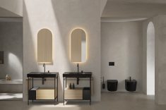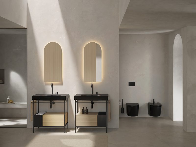 A suíça Laufen também utiliza o Salone del Mobile para apresentar um novo capítulo de sua pesquisa em materiais e tecnologias para o banheiro contemporâneo. No estande da marca, a instalação Experience Tomorrow apresenta coleções e conceitos que exploram novas possibilidades de forma, superfície e produção industrial, incluindo o material VITREON Steel, desenvolvido para ampliar as aplicações do aço esmaltado em peças sanitárias.