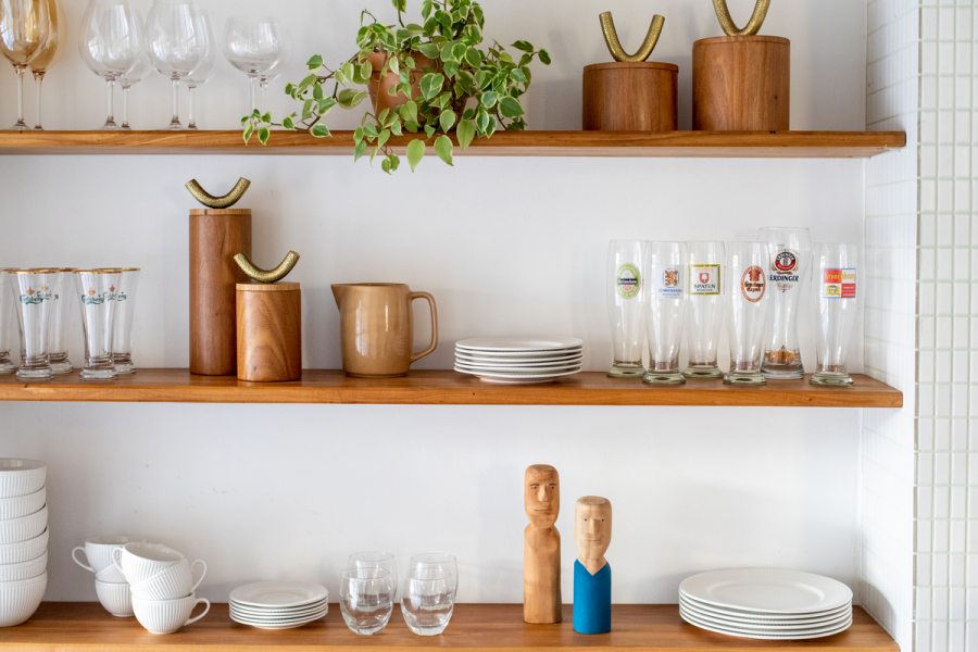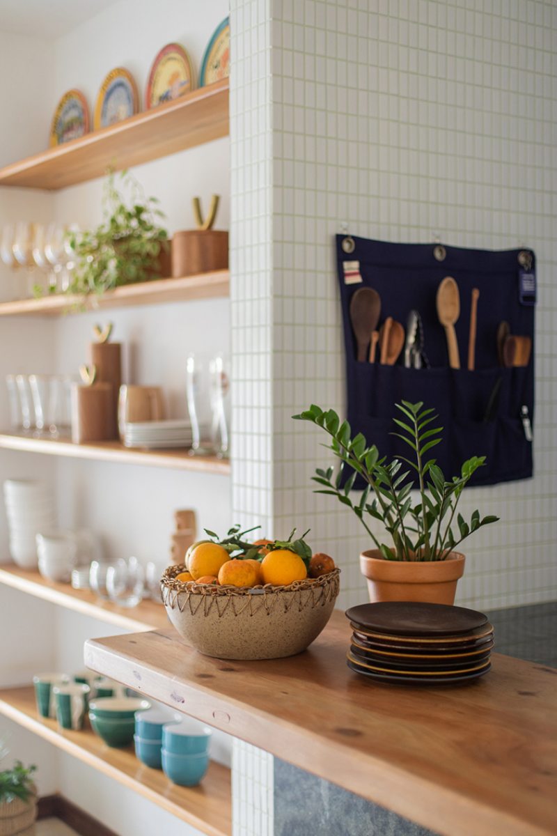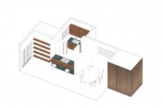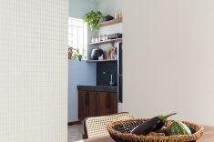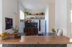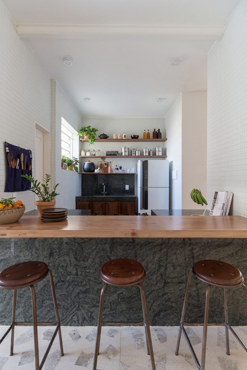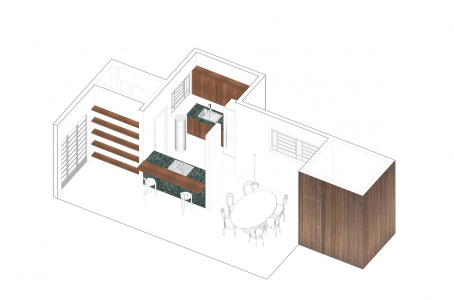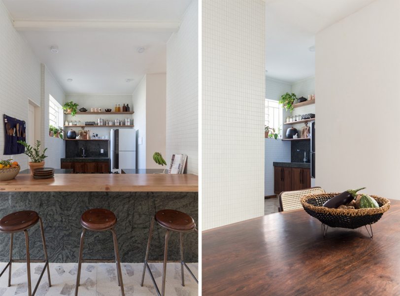 A cozinha foi aberta e estendida em direção à despensa - criando uma relação entre o balcão de refeições rápidas - à sala de jantar e a uma despensa aberta que serve de ligação ao alpendre do quintal. Um corredor secundário que ligava a cozinha original à zona exterior foi transformado numa despensa fechada.