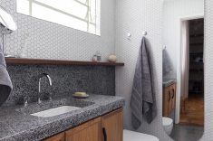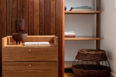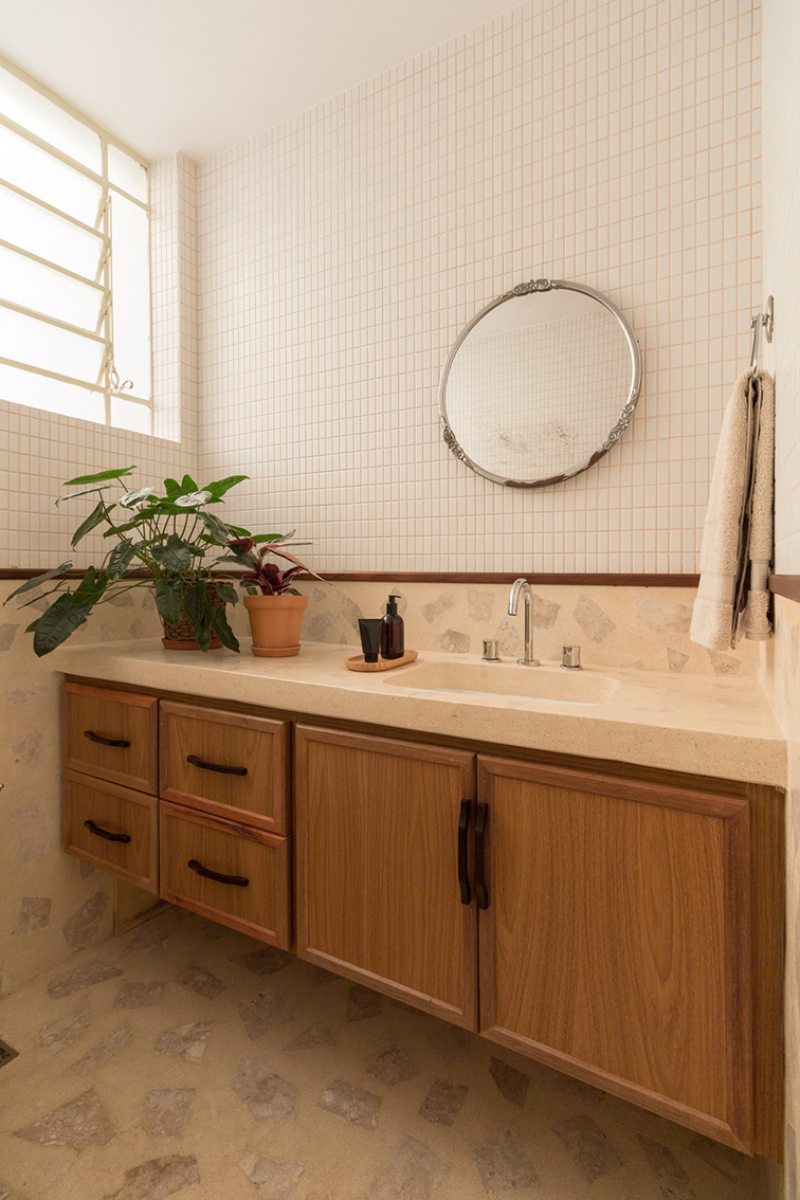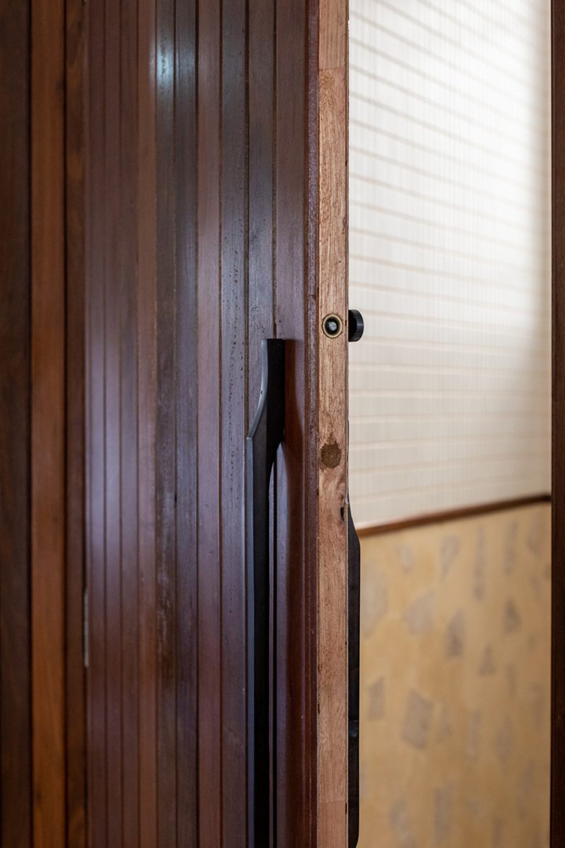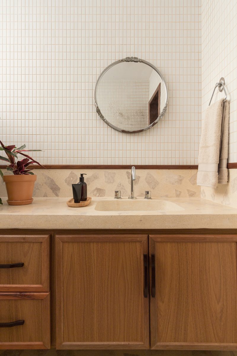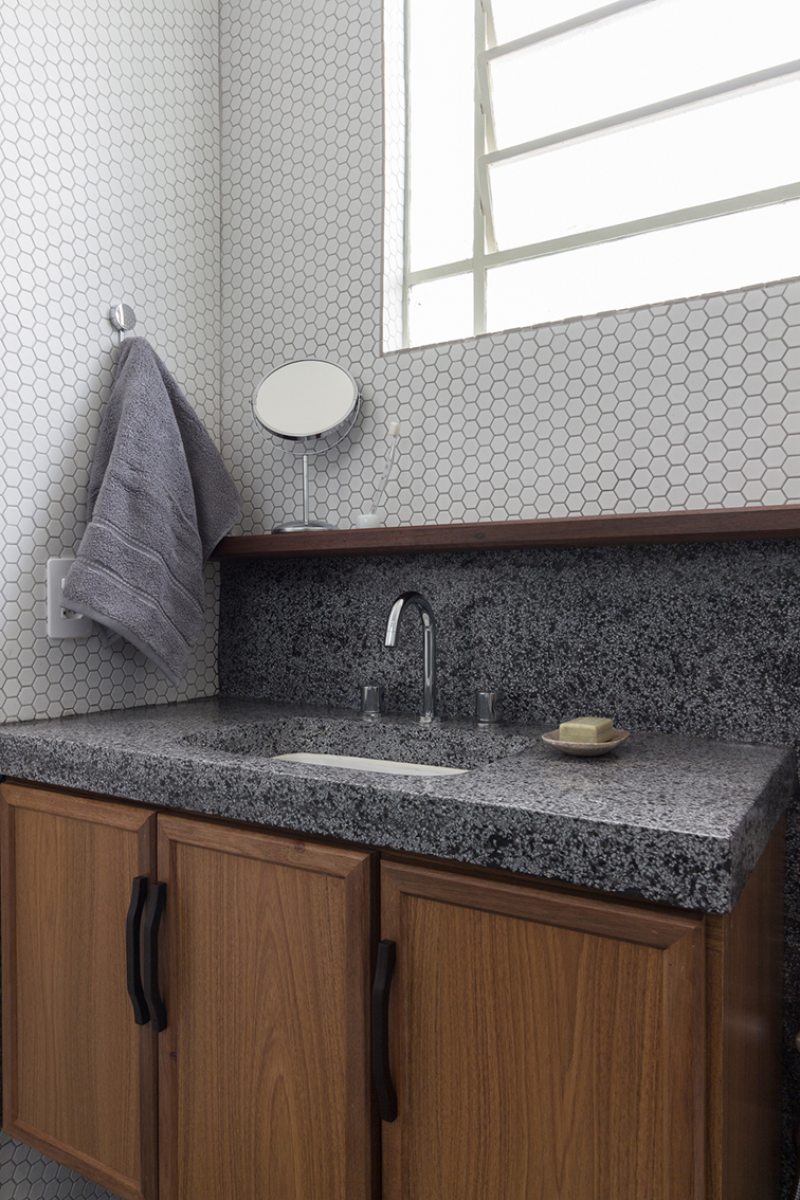 Outro revestimento utilizado foi a marmorita no piso e na parede, elemento recorrente nas construções modernistas, que é um material de qualidade com ótimo custo. Queríamos usar com cacos grandes e fizemos com granito bege baiano descartado. Ainda na questão custo, tivemos a sorte de poder contar com madeira de demolição da fazenda da família do cliente, então foi possível fazer toda a marcenaria com madeira maciça”, diz o profissional.