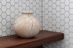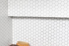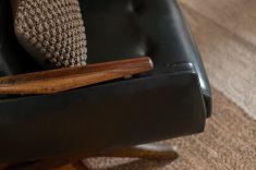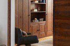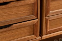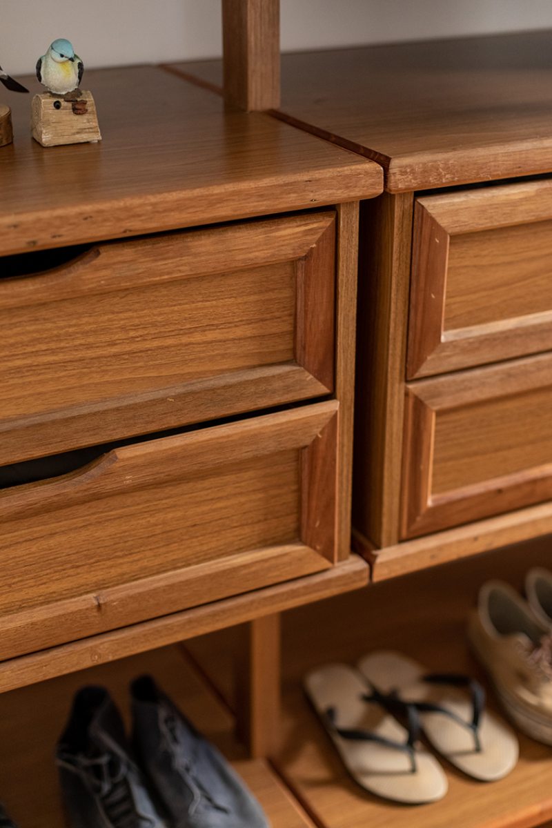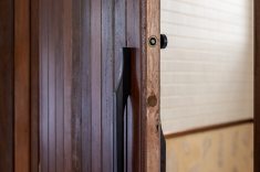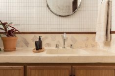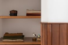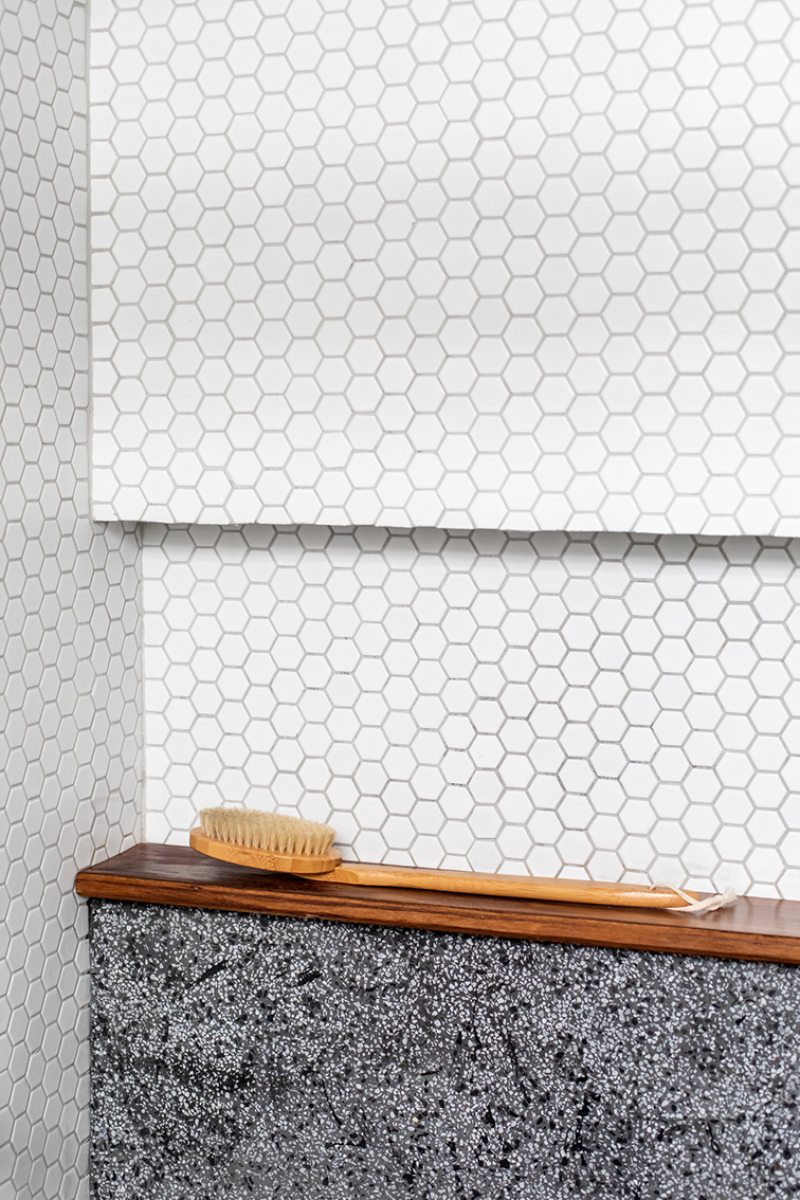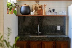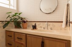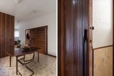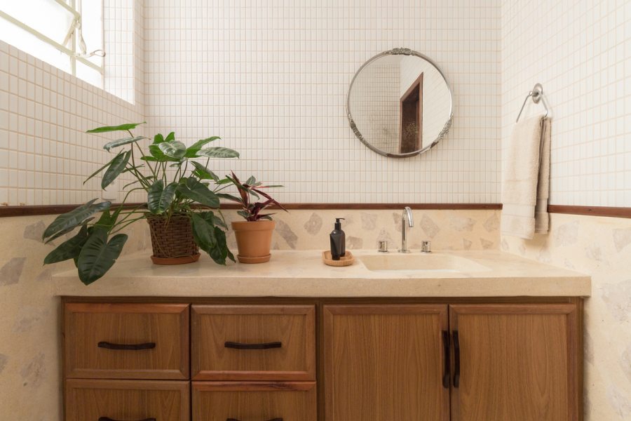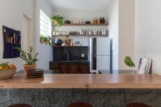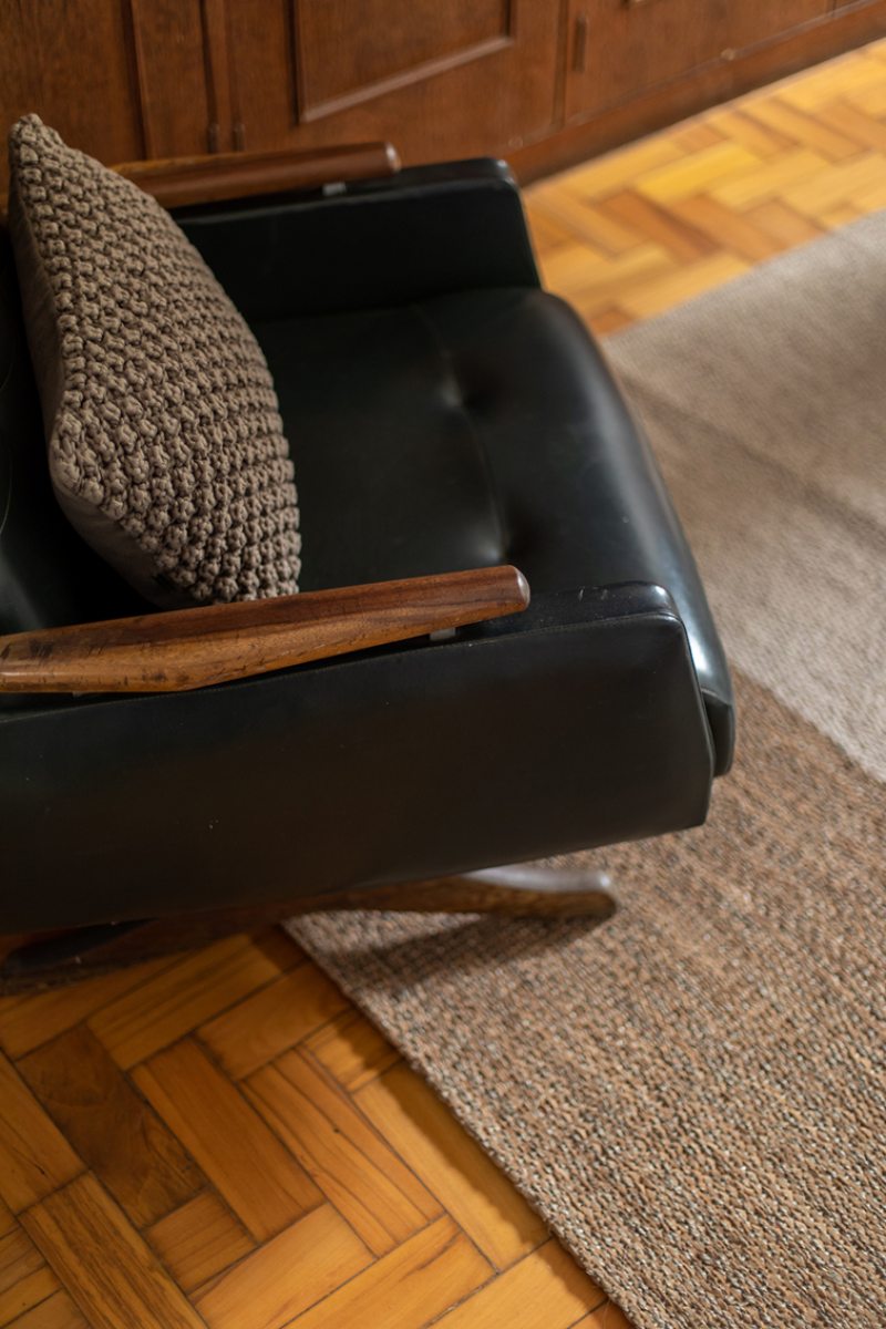 Outro revestimento utilizado foi a marmorita no piso e na parede, elemento recorrente nas construções modernistas, que é um material de qualidade com ótimo custo. Queríamos usar com cacos grandes e fizemos com granito bege baiano descartado. Ainda na questão custo, tivemos a sorte de poder contar com madeira de demolição da fazenda da família do cliente, então foi possível fazer toda a marcenaria com madeira maciça”, diz o profissional.