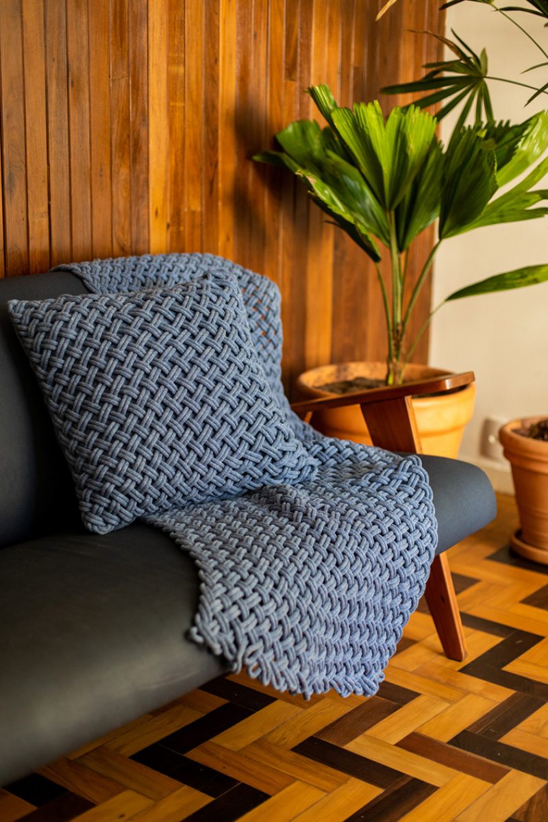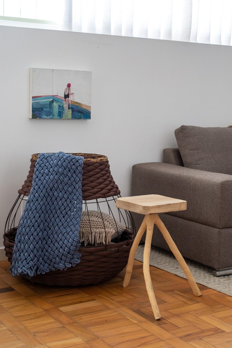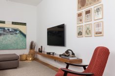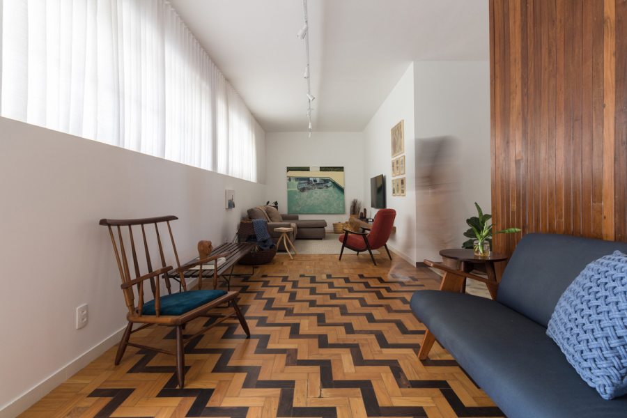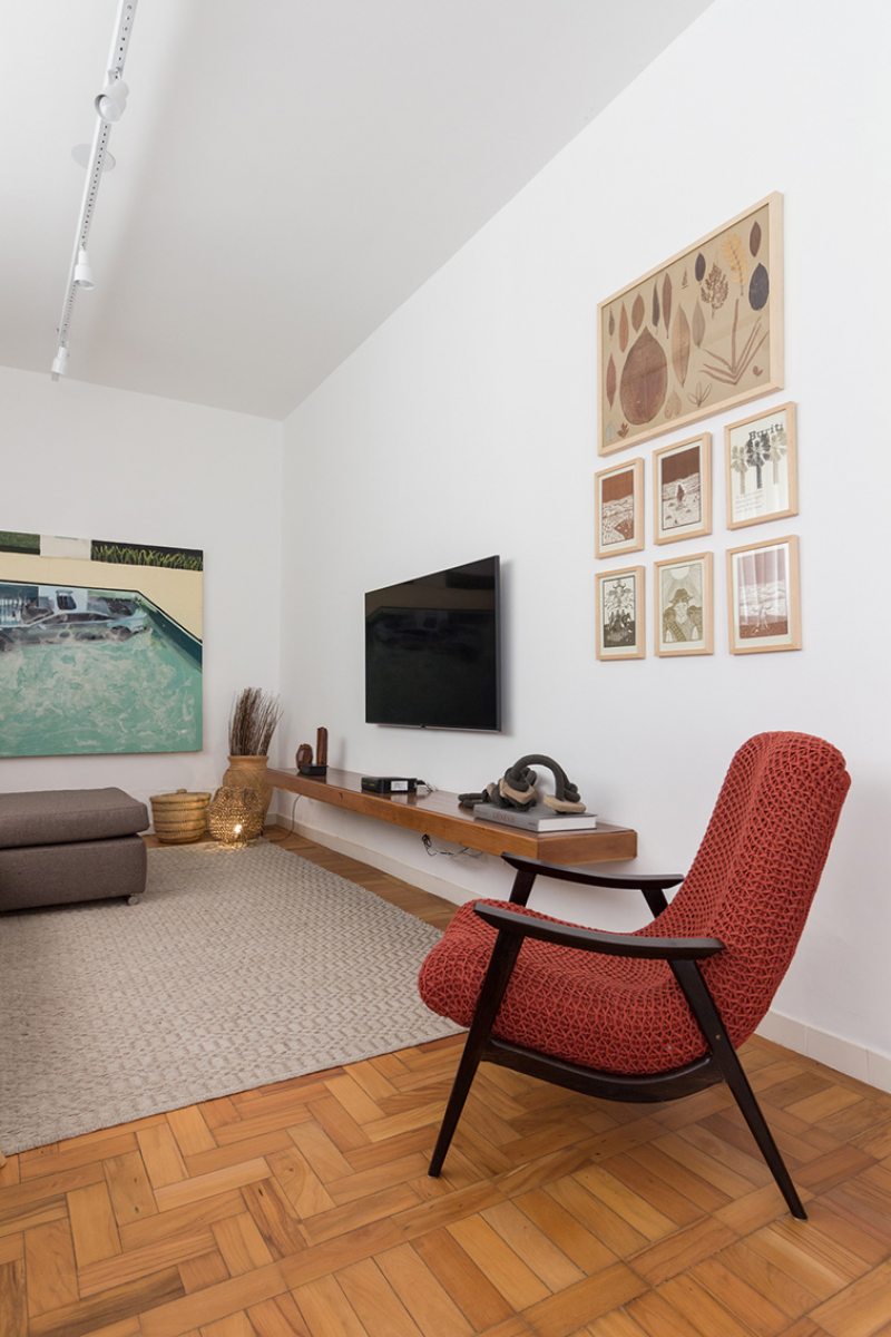 “Com orçamento apertado, optamos por uma planta com poucas modificações, retiramos a parede que dividia a sala e o espaço de TV e reduzimos o banheiro social para criar uma conexão mais confortável entre os espaços.”