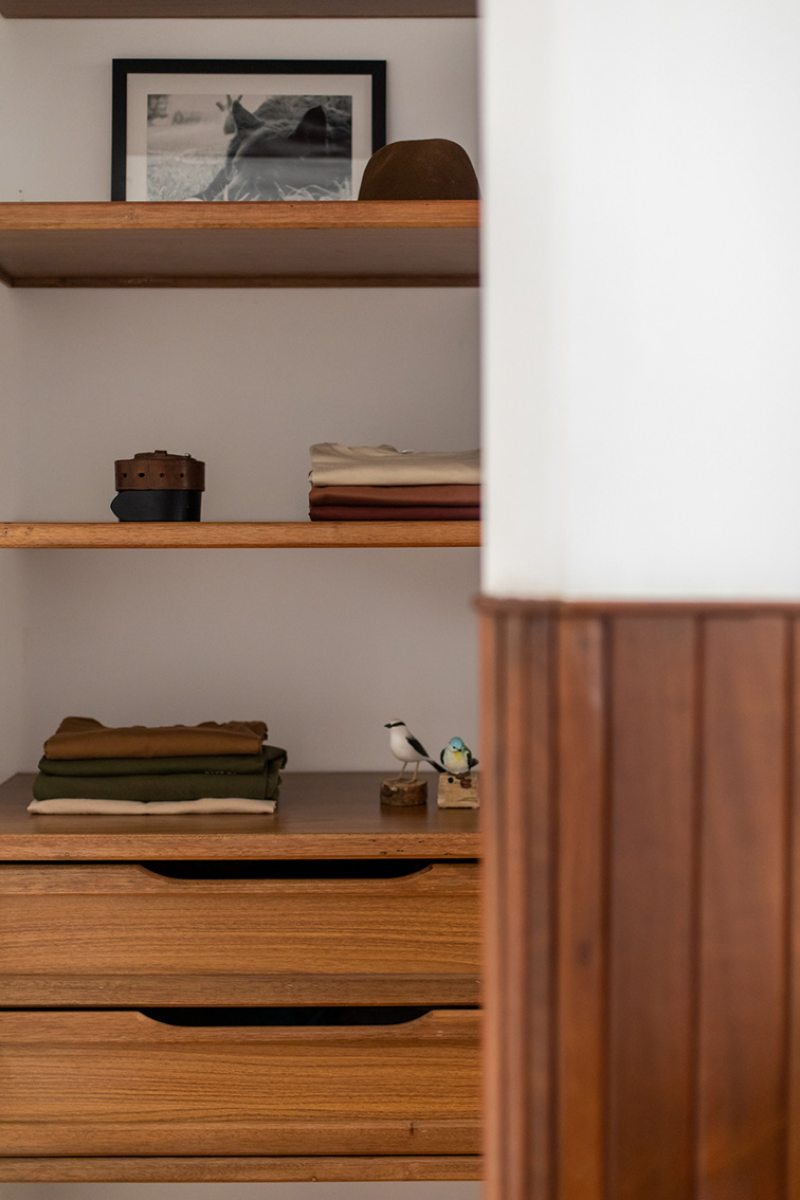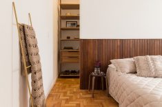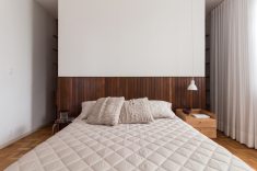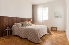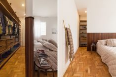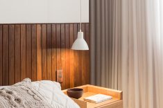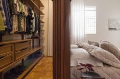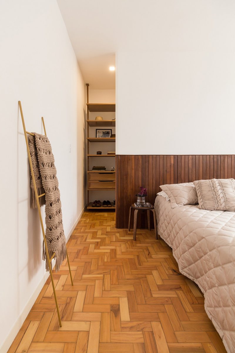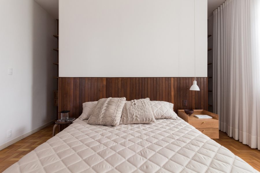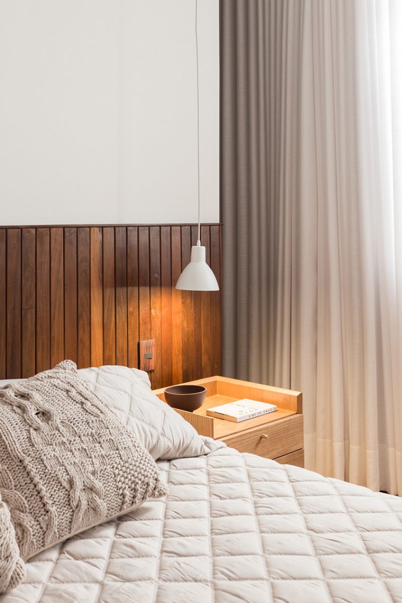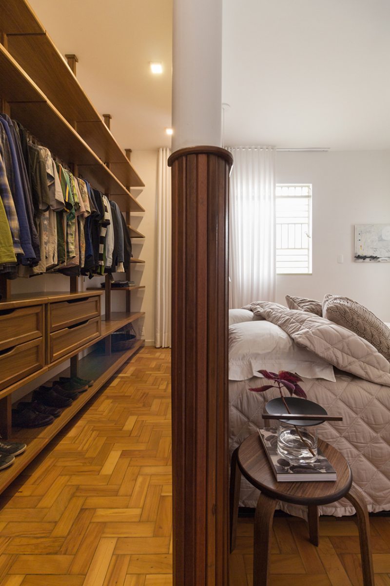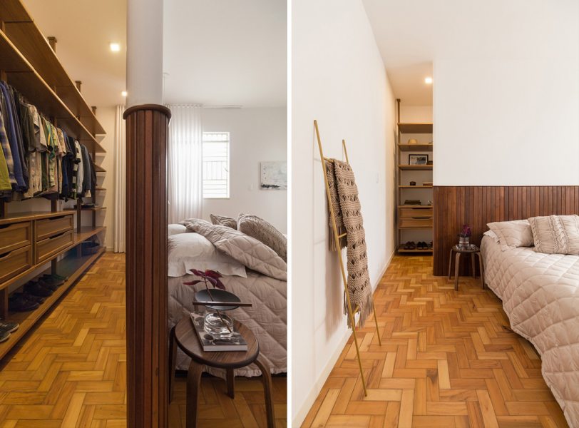 No quarto principal, o armário atrás da parede da cabeceira, executado em lambris e painel de gesso, tem bordas arredondadas e torna fluida a divisão entre quarto e armário.