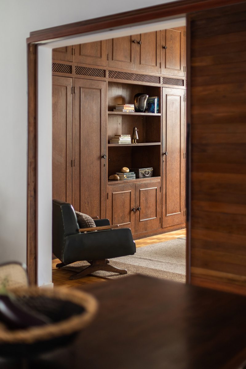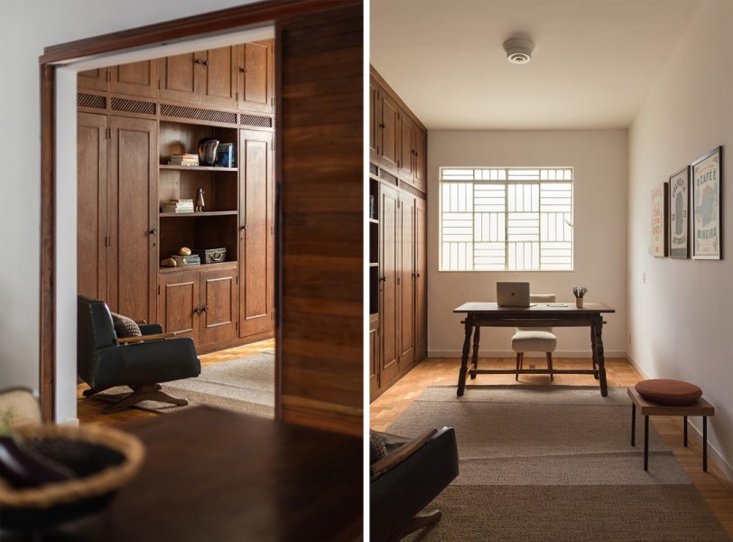 A parede do quarto original foi aberta para transformá-lo em escritório e criar ainda mais amplitude em relação aos espaços sociais. Uma grande porta de veneziana de madeira permite a utilização deste espaço de forma intimista e reservada quando necessário.