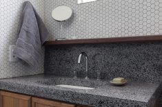 O mármore, os azulejos, os lambris, os painéis de madeira escura, a serralharia em ferro e o uso de pedras naturais, elementos característicos da arquitetura moderna brasileira dão o tom de resgate histórico ao projeto. “Mesmo assim, tivemos o desafio de fazer isso com moderação e buscar o melhor custo possível para a execução. Optamos então por trabalhar com materiais com muita personalidade, mas de baixo custo, como o granito Candeias, um granito barato, que está presente na sua cor verde escuro”, enfatiza Pedro.