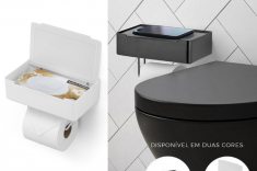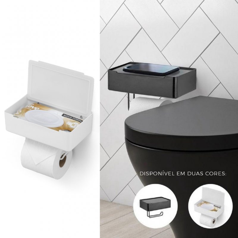 O suporte adesivo acomoda o rolo de papel e traz uma prateleira superior que serve para apoiar o celular, lenços ou outros itens de uso rápido. Pode ser fixado sem furação em superfícies de porcelanato, pedra, mármore, granito ou madeira. Um detalhe útil e elegante para banheiros de qualquer tamanho.