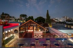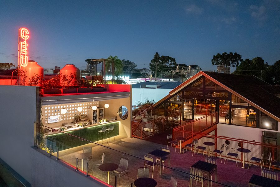 Instalado em uma construção dos anos 1950, o Céu Bar preserva a fachada original e a memória do edifício, mas revela um interior contemporâneo e vibrante. O projeto foi pensado para conectar o visitante ao céu e ao pôr do sol, com grandes aberturas, linhas visuais amplas e integração entre ambientes internos e externos. No térreo, o espaço ao ar livre se abre para a natureza e a convivência, com um bar em estilo vitrine que convida a encontros. Uma escada e passarela metálicas em vermelho conduzem ao rooftop, onde a vista panorâmica da cidade se transforma em palco para a noite curitibana.