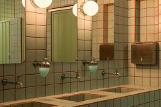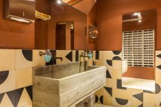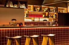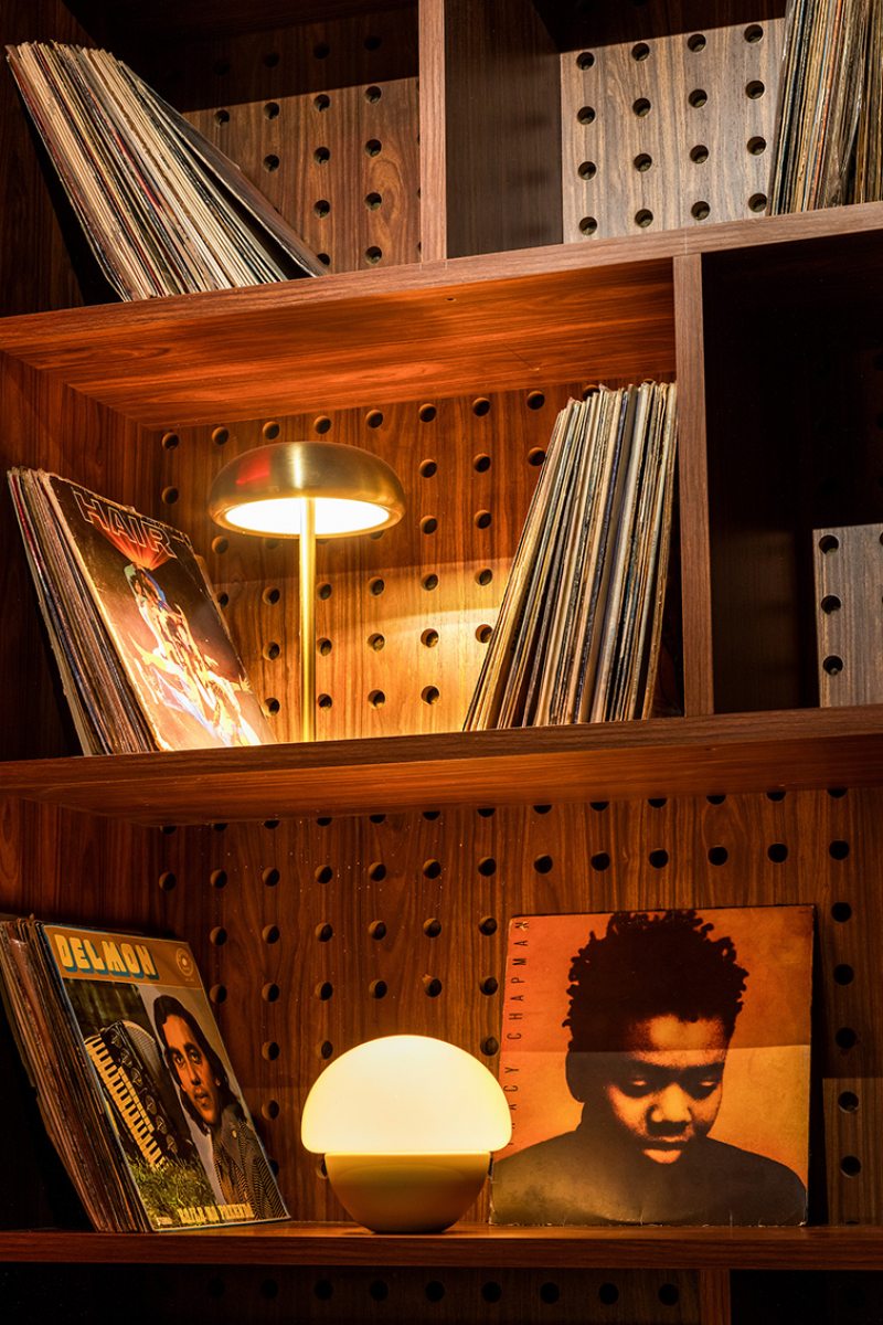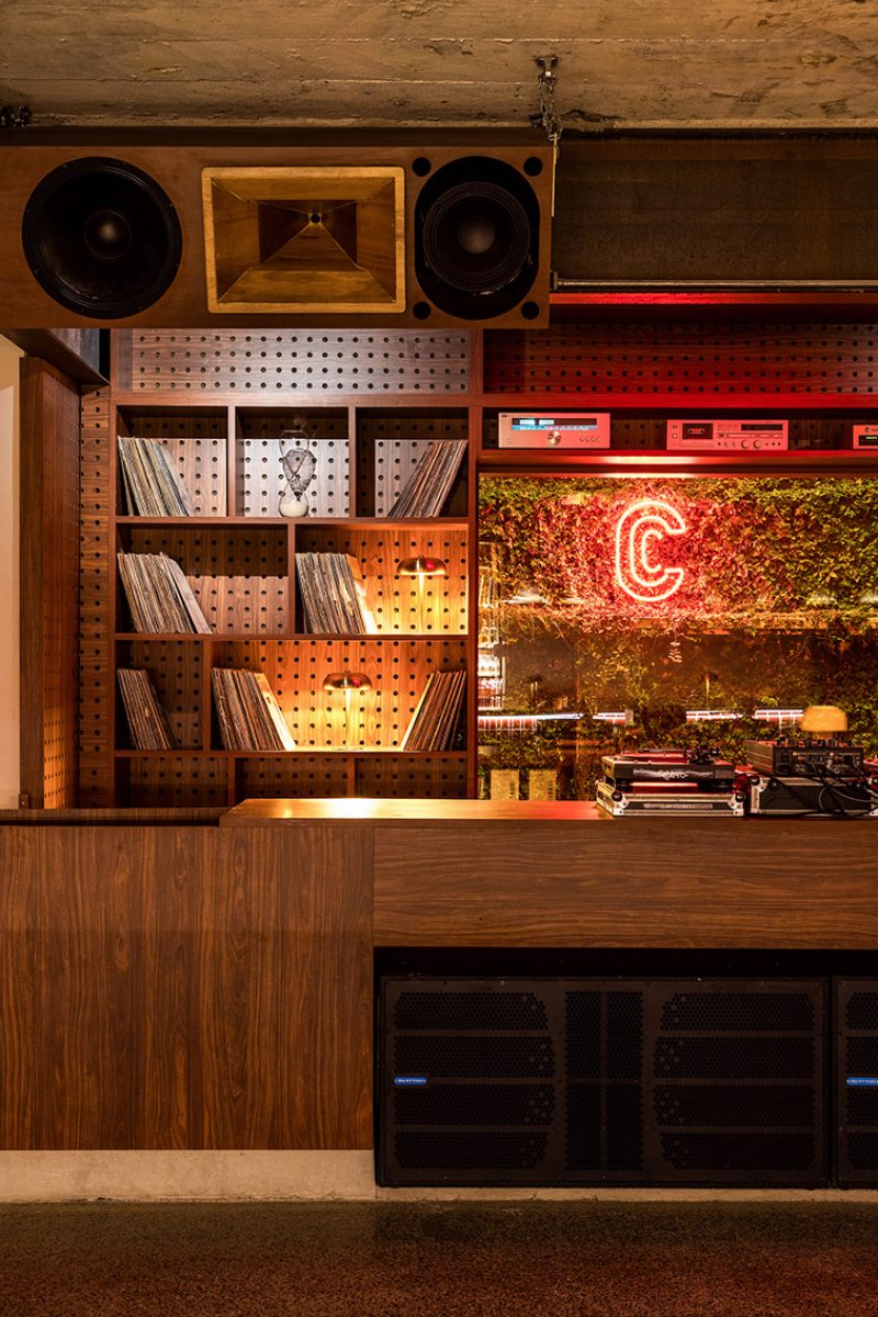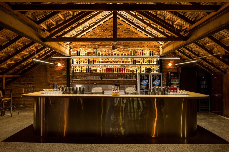 No interior, o contraste entre o antigo e o novo é marcante: telhas cerâmicas e tijolos aparentes preservam a memória, enquanto um bar em inox e iluminação cênica reforçam o tom contemporâneo. O listening bar em madeira, com acústica projetada especialmente para a música, cria um clima envolvente, com balcão em azulejos vermelho-escuros e uma seleção de discos que acompanha a coquetelaria autoral de Gabriel Bueno, finalista do World Class, uma das competições de coquetelaria mais prestigiadas do mundo, que reconhece os melhores bartenders do planeta. As receitas combinam técnicas de clarificação, infusões e defumações, produzidas artesanalmente, sem uso de xaropes industriais.