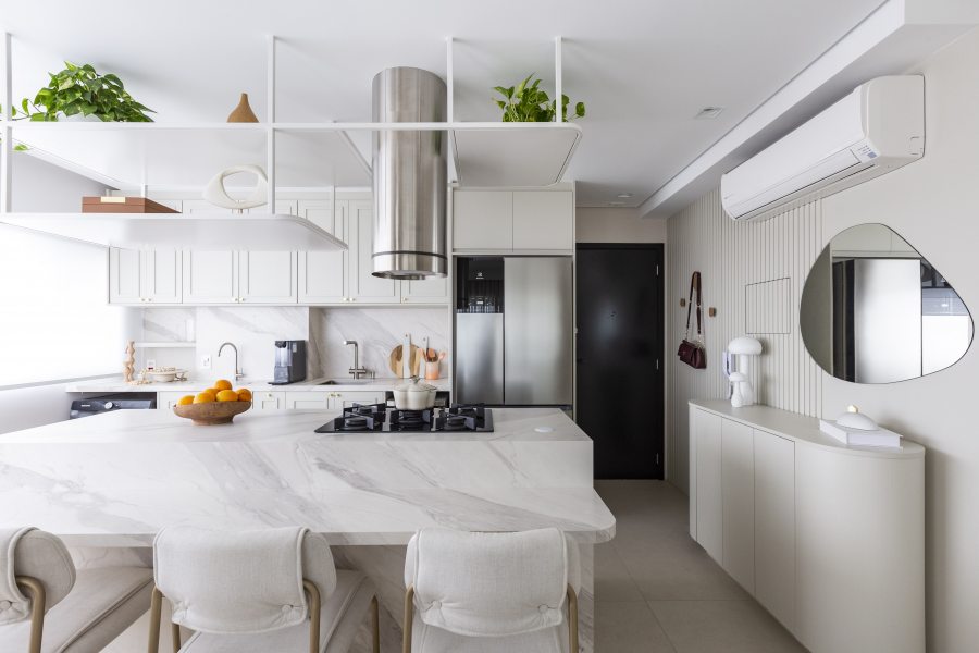 Na sequência, reunimos projetos e produtos que demonstram como o branco — especialmente na leitura proposta pelo Cloud Dancer — estrutura ambientes, valoriza materiais e redefine a percepção espacial.