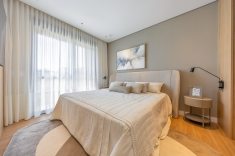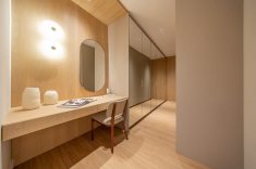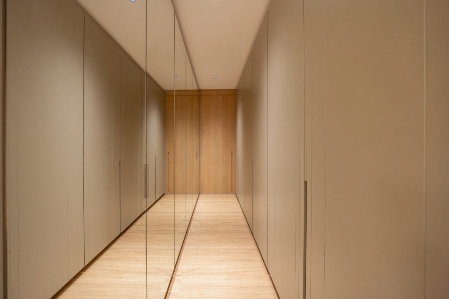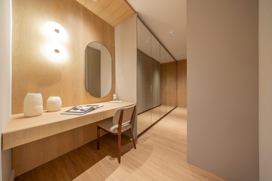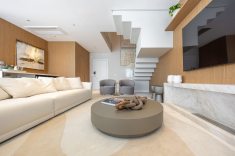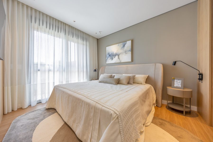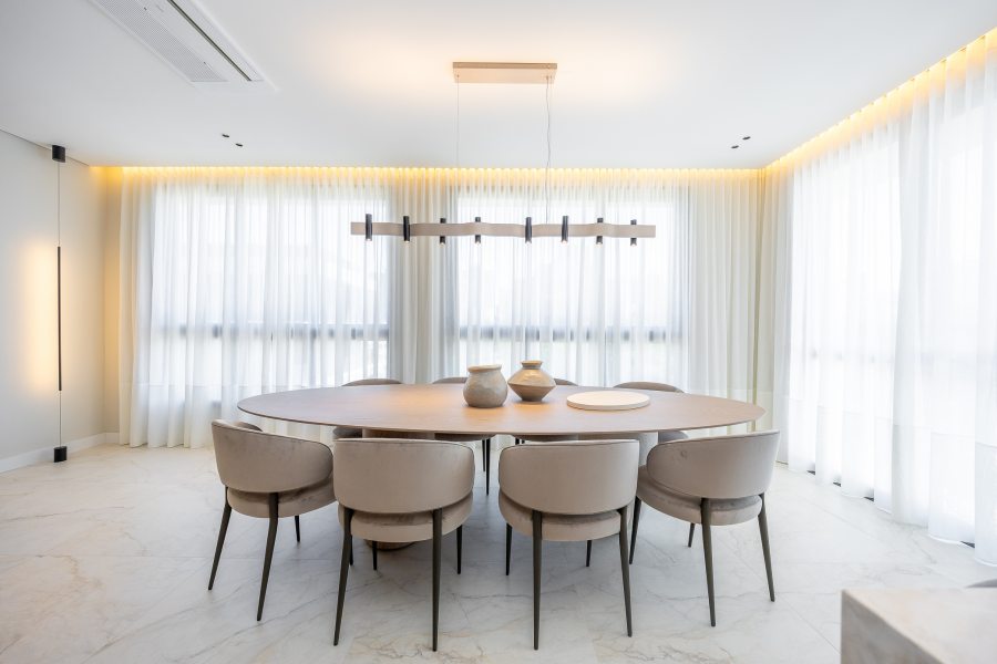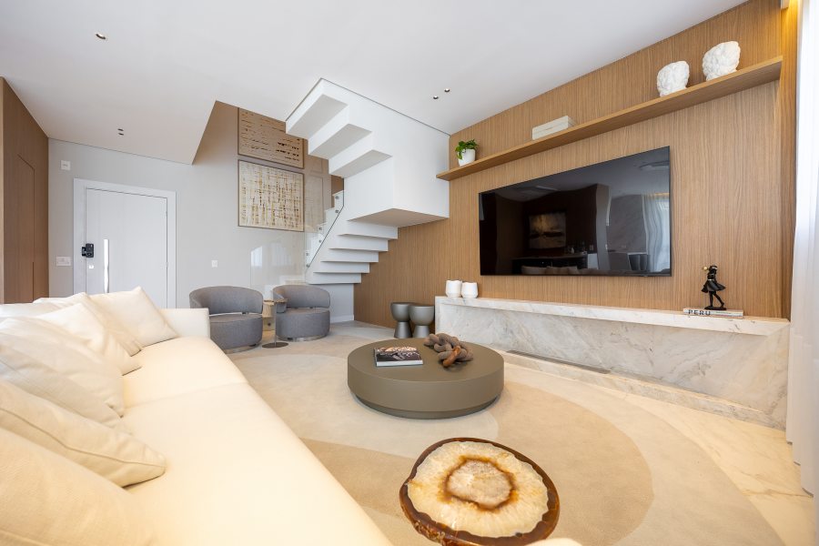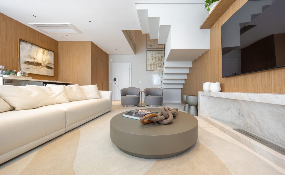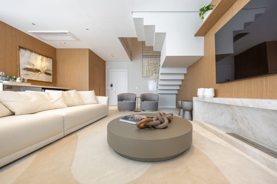 Para garantir a sensação de acolhimento, a escolha dos materiais foi decisiva. A madeira é protagonista no décor, aparecendo em painéis e revestimentos que "abraçam" tanto a sala de estar quanto os quartos. A atmosfera de calma é reforçada pela união de tons neutros com um projeto luminotécnico de temperatura amarela (quente). O resultado é um imóvel que não foca apenas na metragem, mas na experiência sensorial e no significado do morar.