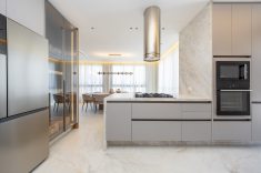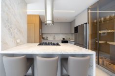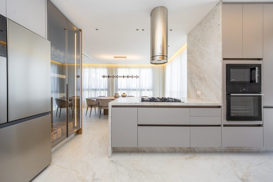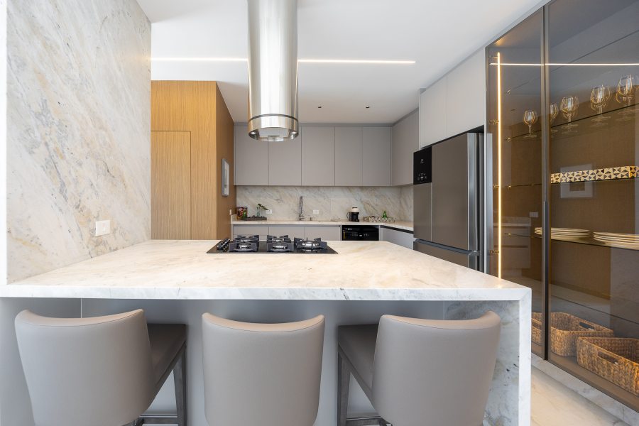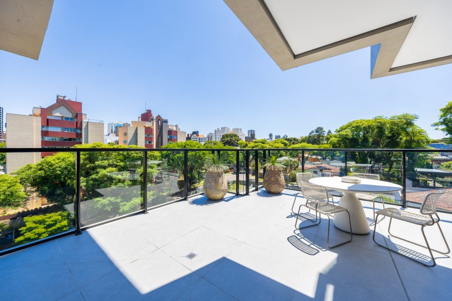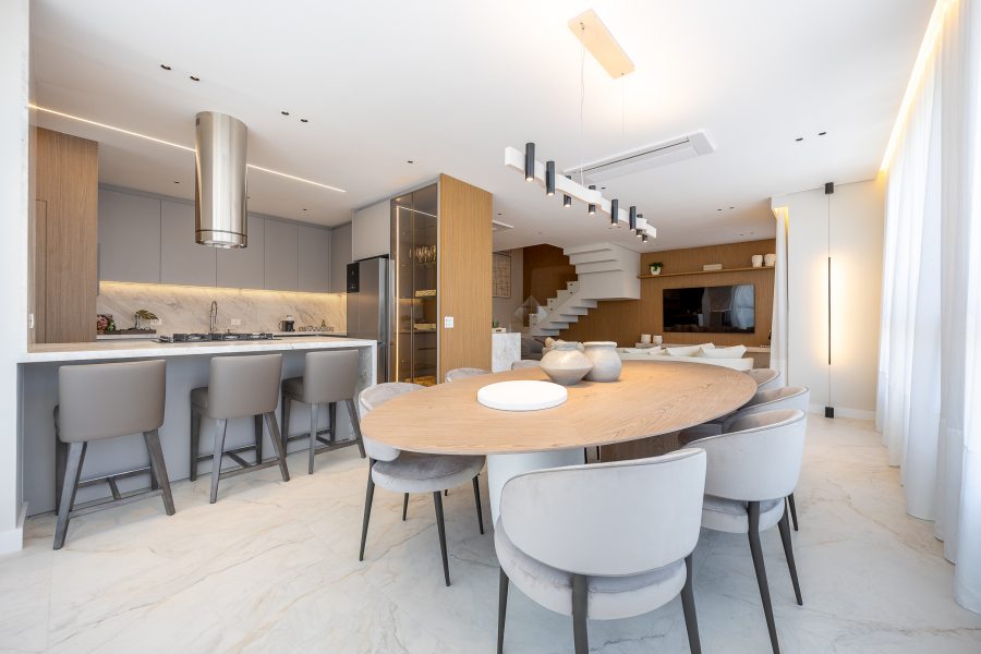 Ao assumir o projeto de interiores, a arquiteta Lisiê Pissetti buscou inspiração na estética italiana, adaptando-a para a realidade e o clima curitibano. A planta dispõe de três suítes e aposta na fluidez: áreas de circulação amplas conectam o living à cozinha em conceito aberto. Essa área social se estende até o terraço privativo, trazendo a paisagem do entorno para dentro de casa.