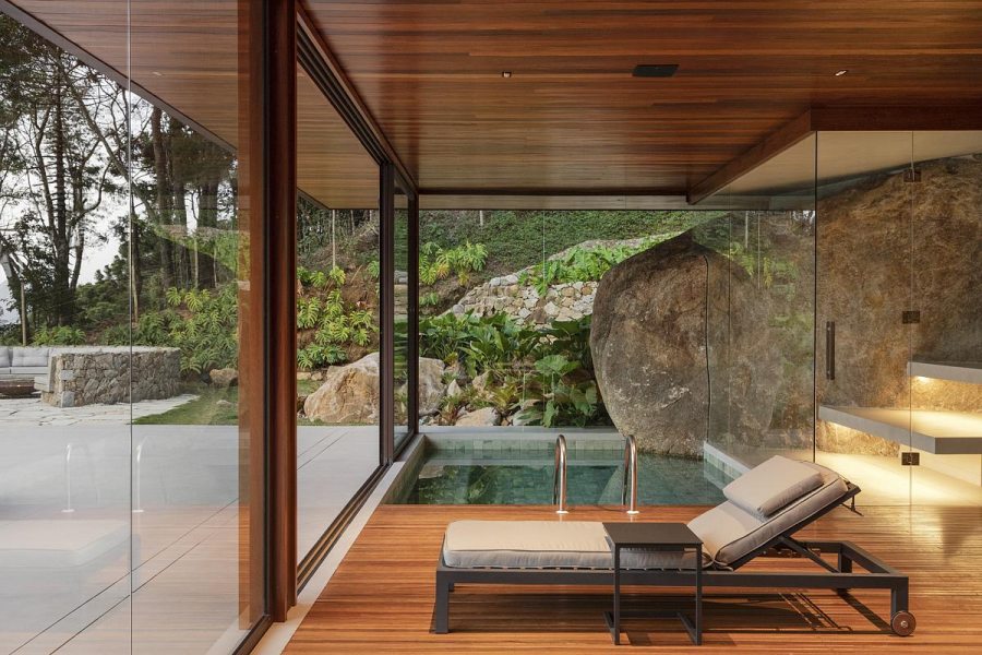 A solução foi trabalhar com um volume alongado, paralelo às linhas de contorno, e acomodar os níveis em relação ao terreno. “Muitas pedras foram encontradas – as maiores foram usadas para sustentar a construção, como no caso da garagem e do volume da sauna, onde as pedras ficaram expostas. As pedras menores foram usadas nas paredes e também divididas para servir como revestimento de parede – cada pedra foi bem aproveitada”, revela o arquiteto Maurício Magarão, do escritório Magarão e Linderbeg.