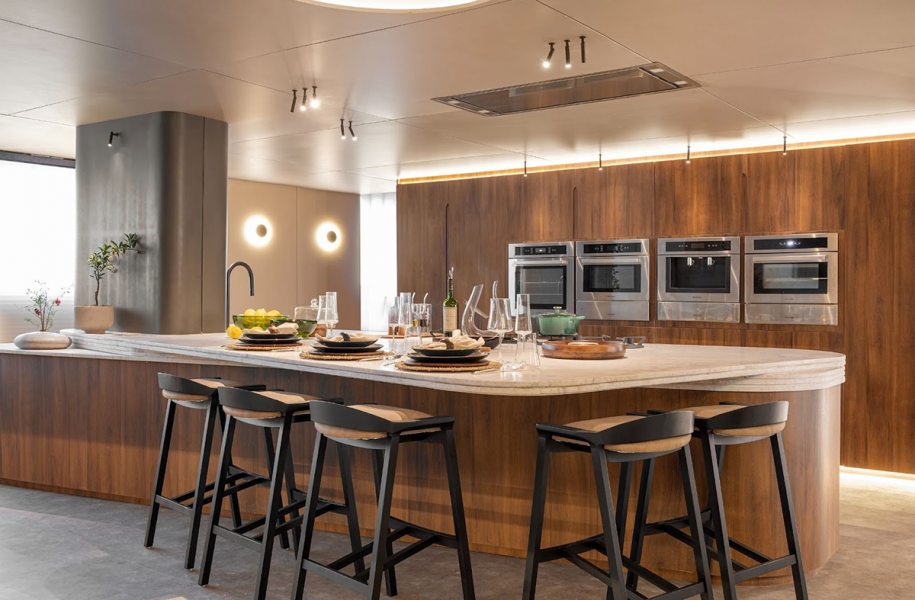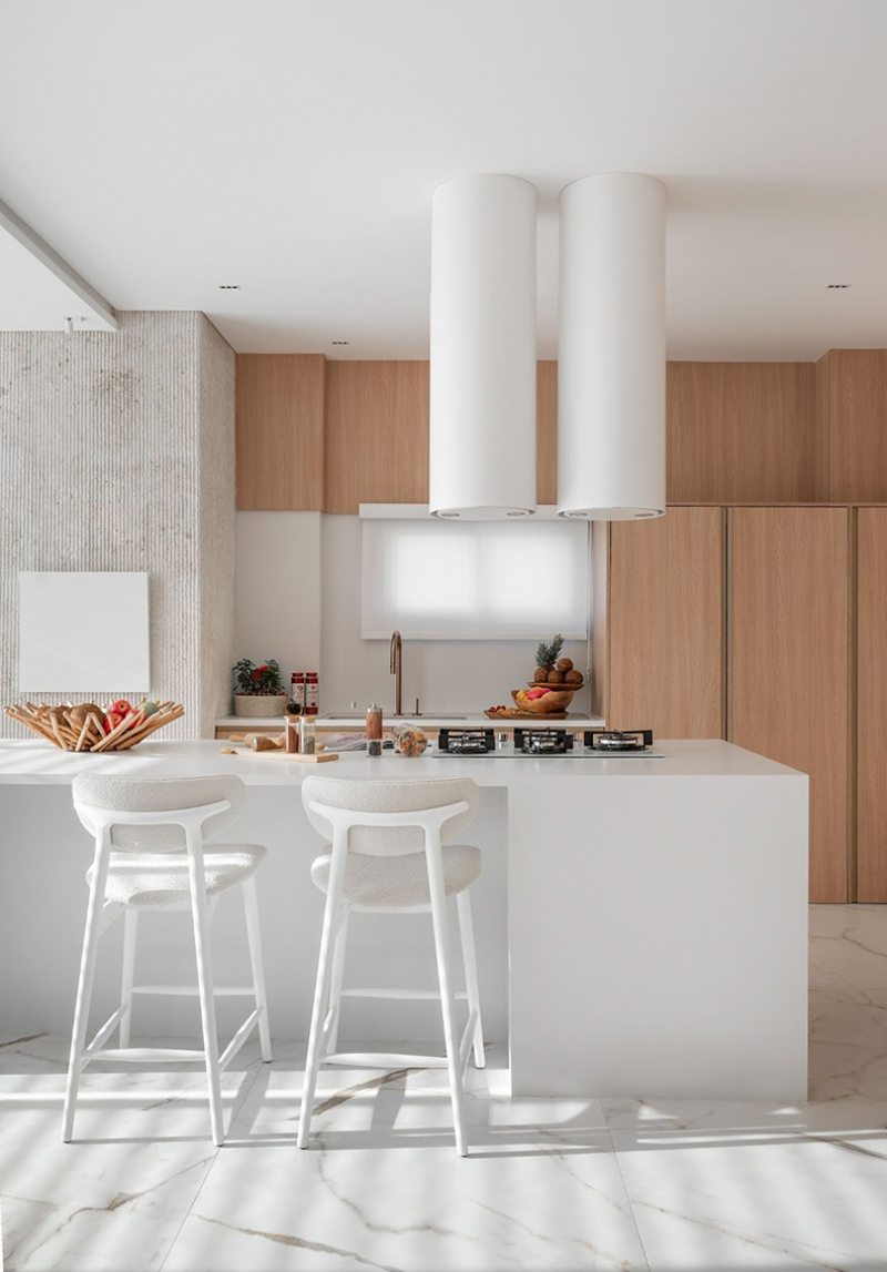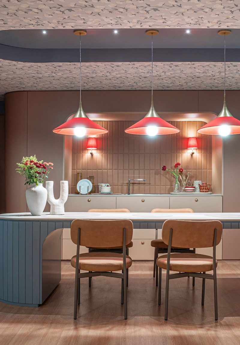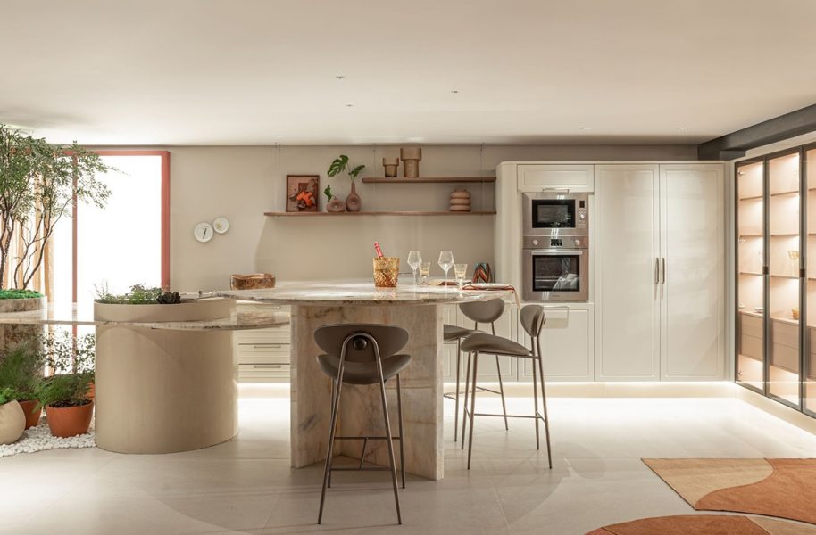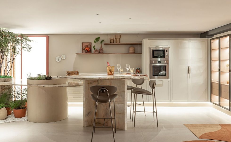 As formas orgânicas estão em alta e aparecem com delicadeza nesta cozinha inspirada na natureza. Contornos suaves e traços curvos reforçam a tendência de um design mais fluido e acolhedor.