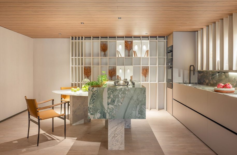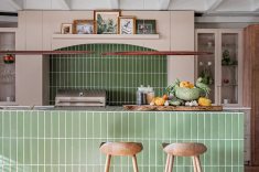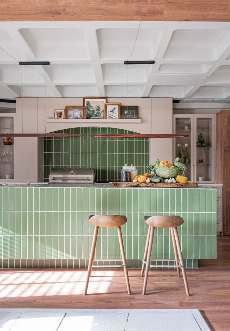 O conceito de biofilia está presente nos materiais naturais e nos tons verdes que se espalham pelas superfícies, conectando a cozinha com a natureza de forma sensorial.