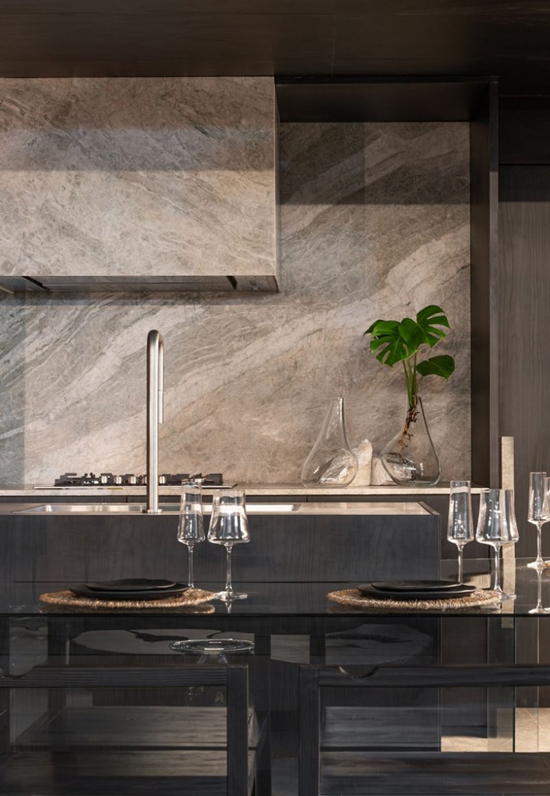 Cores profundas e texturas sensoriais marcam este espaço, que aposta na fluidez dos volumes e integração da cozinha com o estar para criar experiências imersivas.