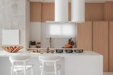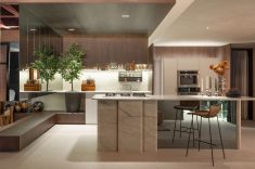 Cozinhas integradas com ilha central continuam em alta. Aqui, elas ajudam a valorizar o convívio, com visual elegante e materiais naturais como madeira e pedra.
