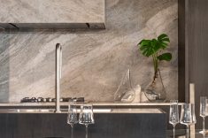 A bancada em pedra sinterizada reforça a busca por sofisticação com alta durabilidade. O material é tendência para quem quer beleza com desempenho técnico.