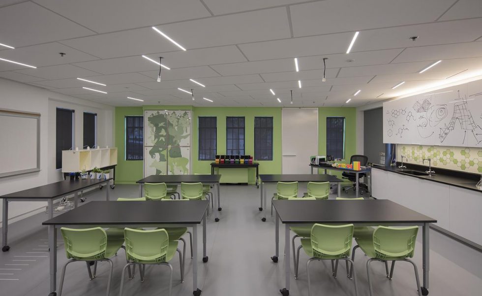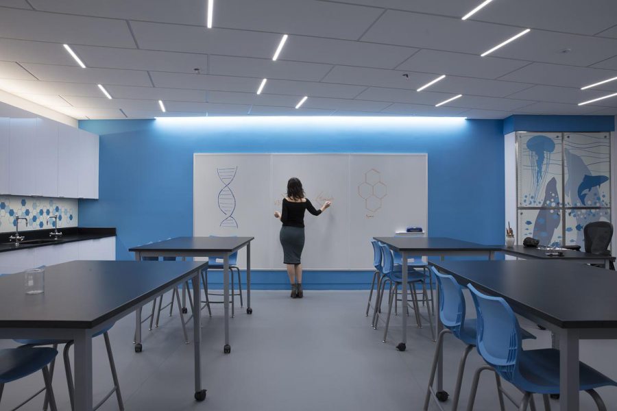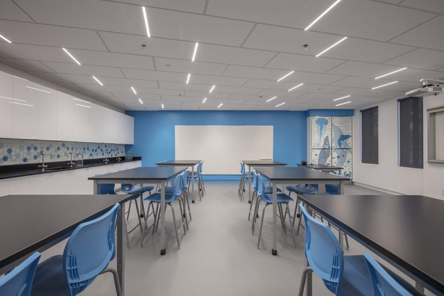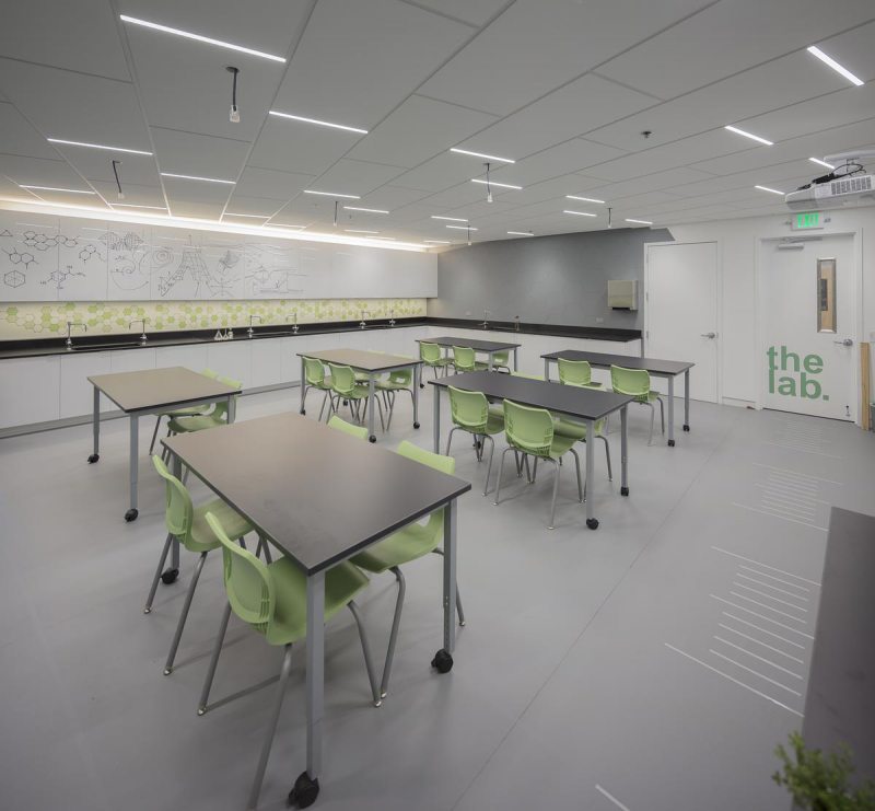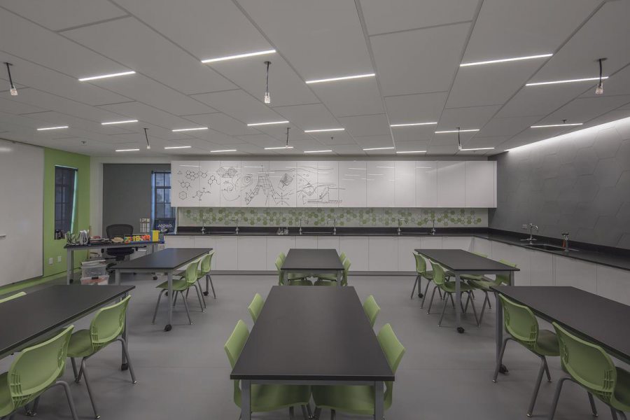 A visão para essas salas de aula era clara: fundir a função com uma estética inspirada no próprio currículo. Antes de qualquer consideração estética, o foco principal do projeto foi a funcionalidade. A equipe reconheceu que as salas de aula de ciências do ensino médio exigiam um ambiente prático e adaptável. Isso se traduziu em uma série de características de design cuidadosamente planejadas.