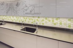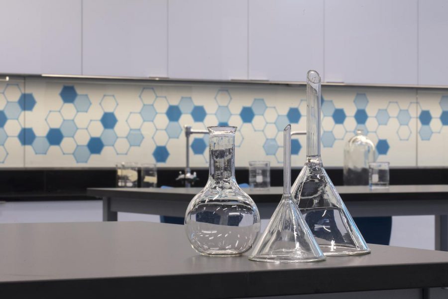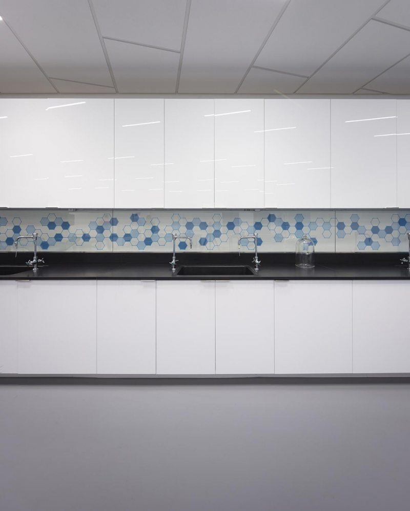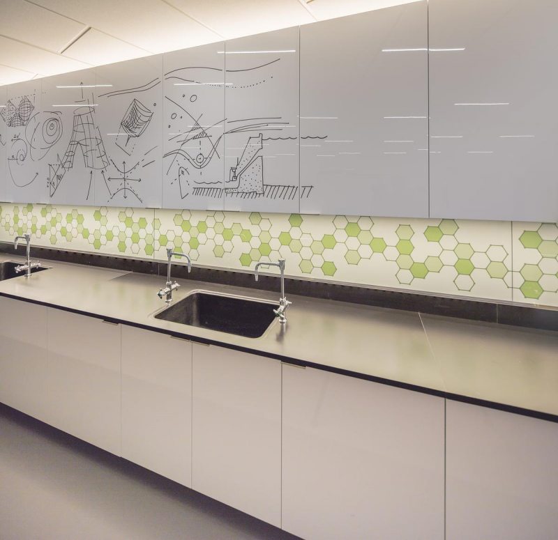 Bancadas e backsplashes duráveis e fáceis de limpar: o uso intenso inerente a um laboratório de ciências exigiu materiais que pudessem suportar o desgaste diário e fossem simples de higienizar, garantindo um ambiente limpo e seguro.