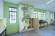 Onde o projeto realmente se destaca é na forma como a decoração é perfeitamente integrada ao currículo científico. As salas de aula foram divididas com base nos temas do currículo: