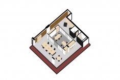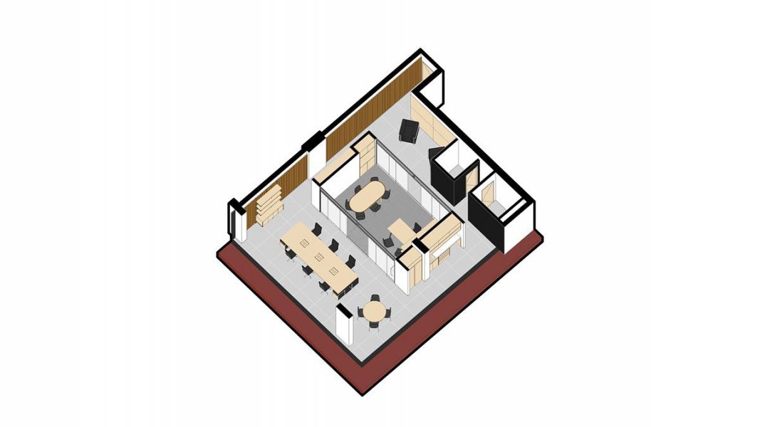 A presença de um pilar na faixa central da sala serviu de apoio para a criação de um volume central que setoriza e organiza o fluxo no espaço. Aglutinou-se ali, a sala de reuniões e o escritório da diretoria, que dividem o espaço ao redor em armazenagem, apoio, recepção e trabalho.