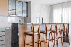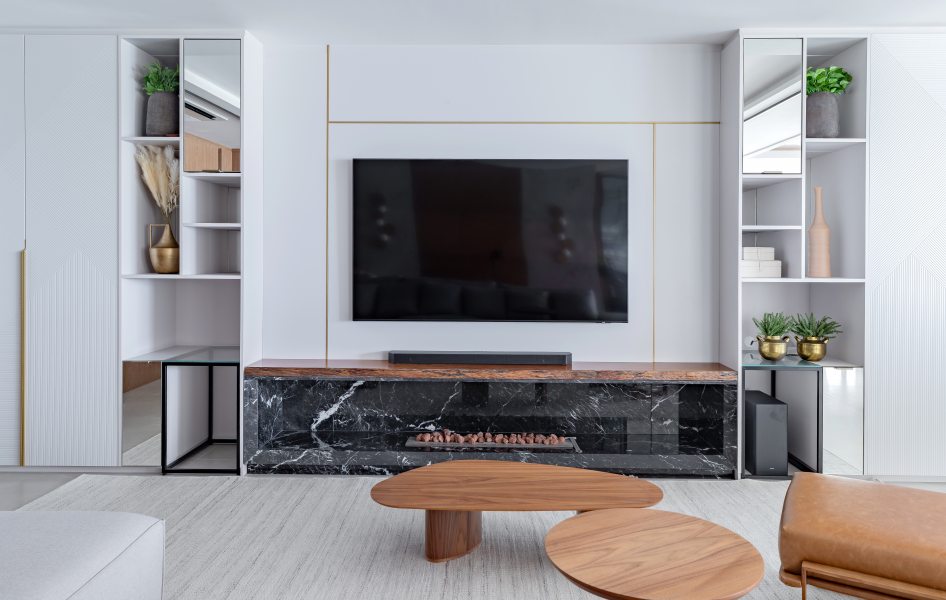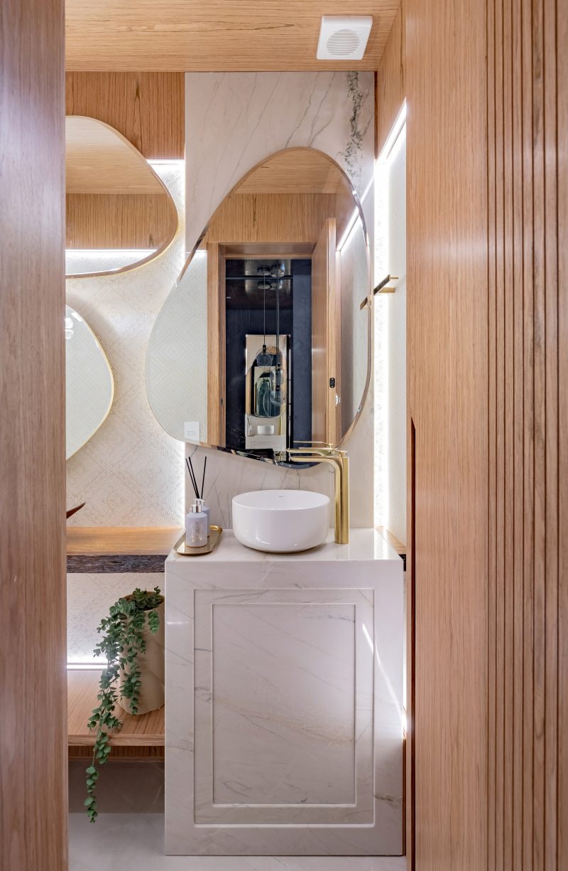 A área social orienta a proposta. O layout privilegia espaços conectados para convivência. Painéis em marmoraria revestem paredes, e o piso em porcelanato 80 × 160 contribui para a leitura contínua dos ambientes. O mobiliário inclui peças assinadas por designers brasileiros, como a Poltrona Eixo, de Rejane Carvalho Leite, as cadeiras BEC, de Luan Dal Sálvio, e poltronas giratórias de Pepe Lima.
