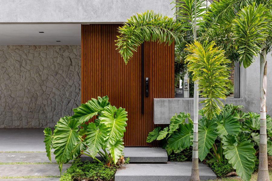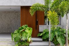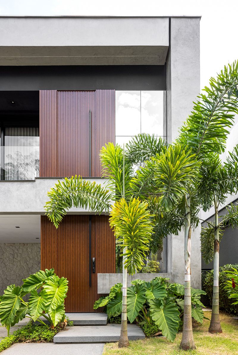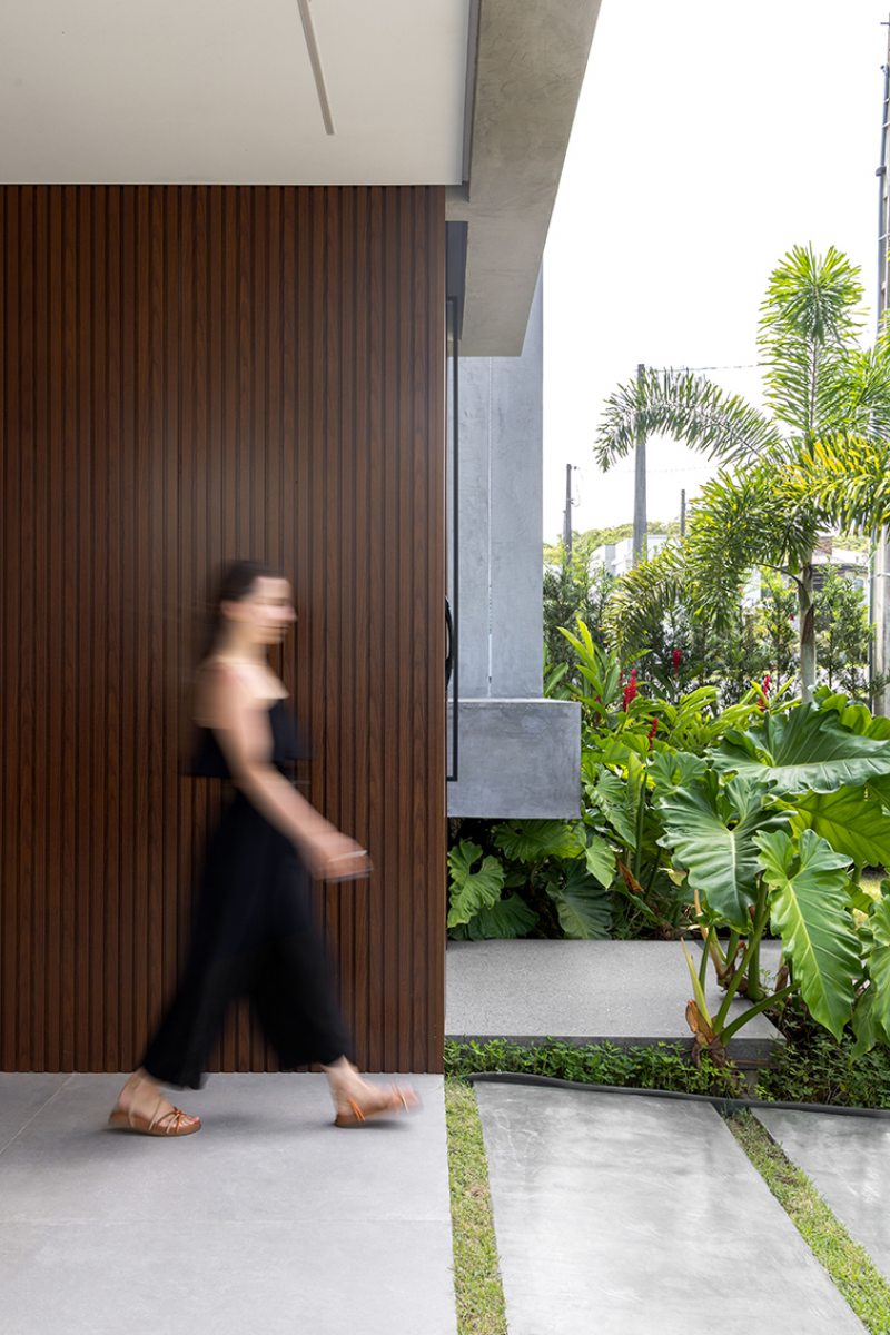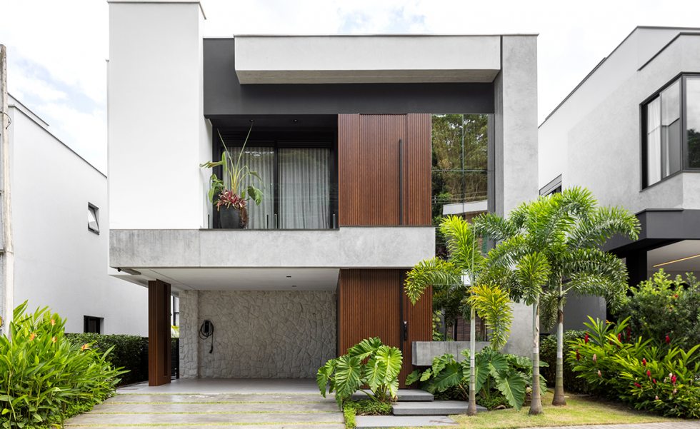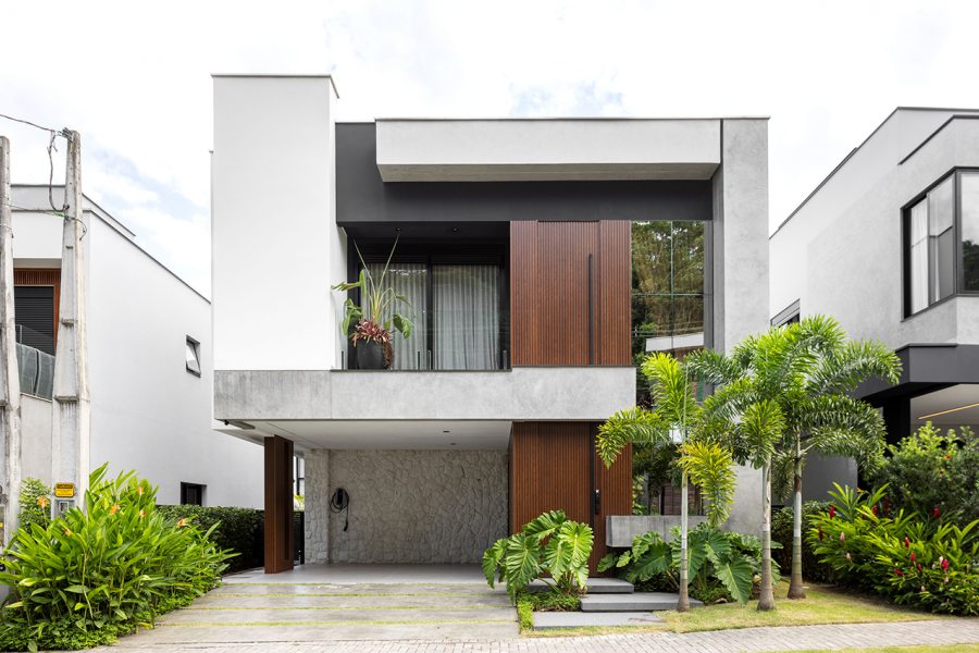 Um tipo de fachada tem se repetido em projetos recentes e indica a preferência por casas com volumetria simples, mas com leitura forte. Em vez de muitos elementos, a casa ganha identidade a partir de volumes que avançam e se encaixam, criando profundidade sem complicar o desenho. A escolha de poucos materiais, aplicados de forma bem-marcada, reforça essa leitura mais direta, batizada de arquitetura contemporânea minimalista ou até “modernismo tropical”, quando incorpora vegetação e materiais naturais.