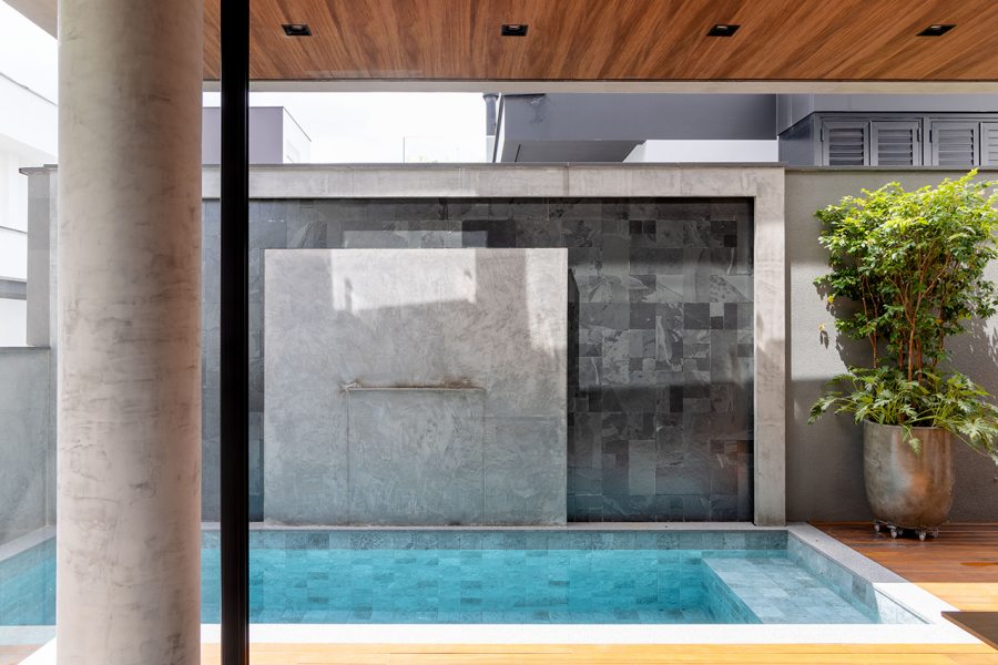 Neste projeto do Studio Kaza, elementos retos e limpos avançam, recuam e se sobrepõem. O volume superior funciona como uma peça em “C” parcialmente aberta, que enquadra o vazio central (varanda/abertura). Já o bloco lateral mais alto e o plano horizontal formam uma espécie de “L” estrutural que ancora visualmente o conjunto, evitando que a casa se transforme em um bloco único com cara de caixa simples. Também pesa muito na proposta a mistura equilibrada de concreto que reforça o aspecto urbano e a madeira que aproxima a casa de uma escala mais acolhedora. A vegetação abraça o conjunto e ajuda a integrar os volumes à paisagem, suavizando a leitura do conjunto.