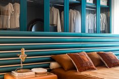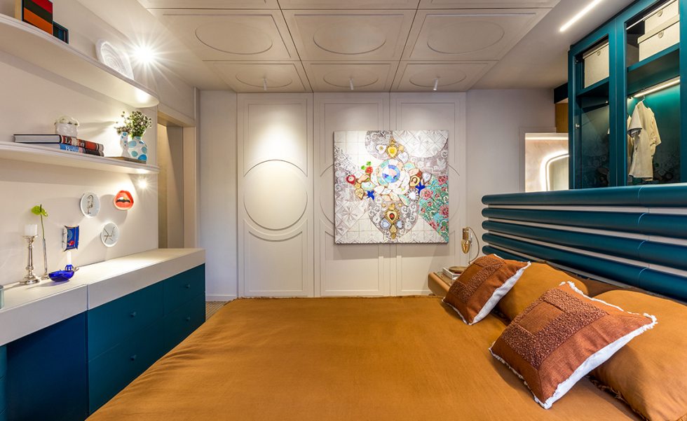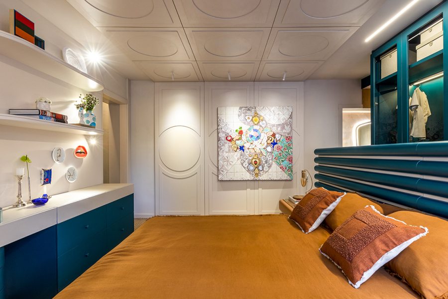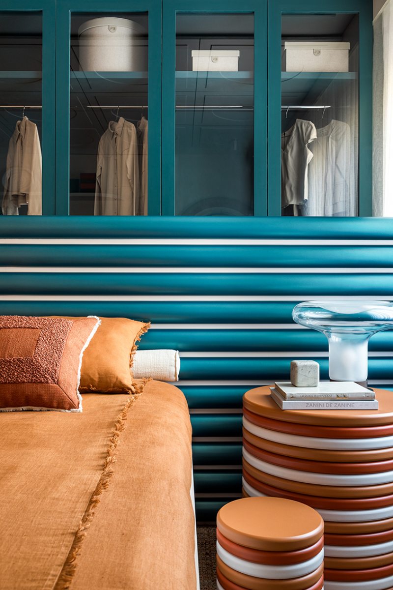 O laranja, sendo uma cor quente, traz uma sensação de aconchego e conforto, enquanto o azul, sendo uma cor fria, adiciona frescor e tranquilidade ao espaço. A ideia da profissional foi também personificar as memórias afetivas dos anos 80 transportando-as para a atualidade de um casal descolado e de alma jovem.