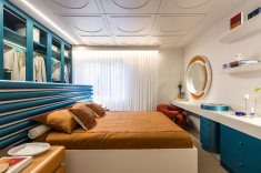 Onde: Curitiba • 14 de Junho - 2024 | Fotos Eduardo MacariosInspirado nos anos 80, o quarto relembra a marcenaria embutida típica da época com elementos curvos e coloridos