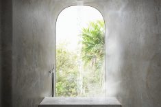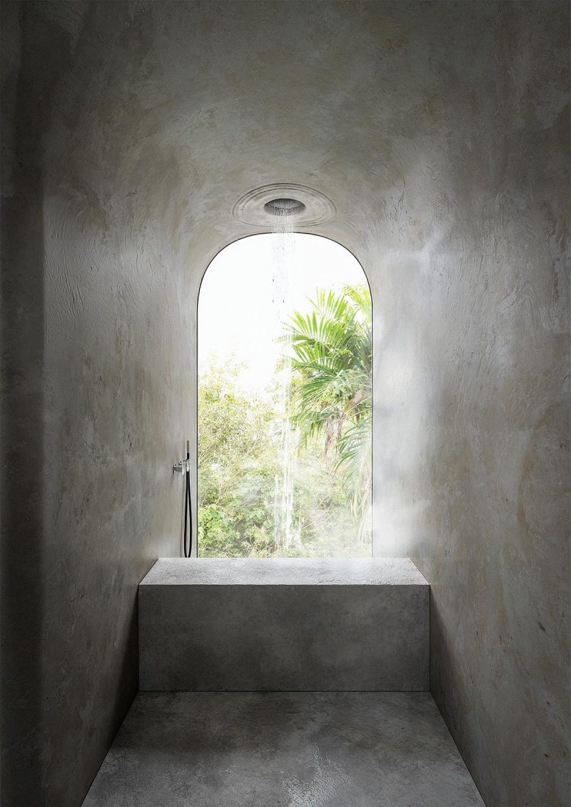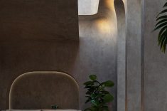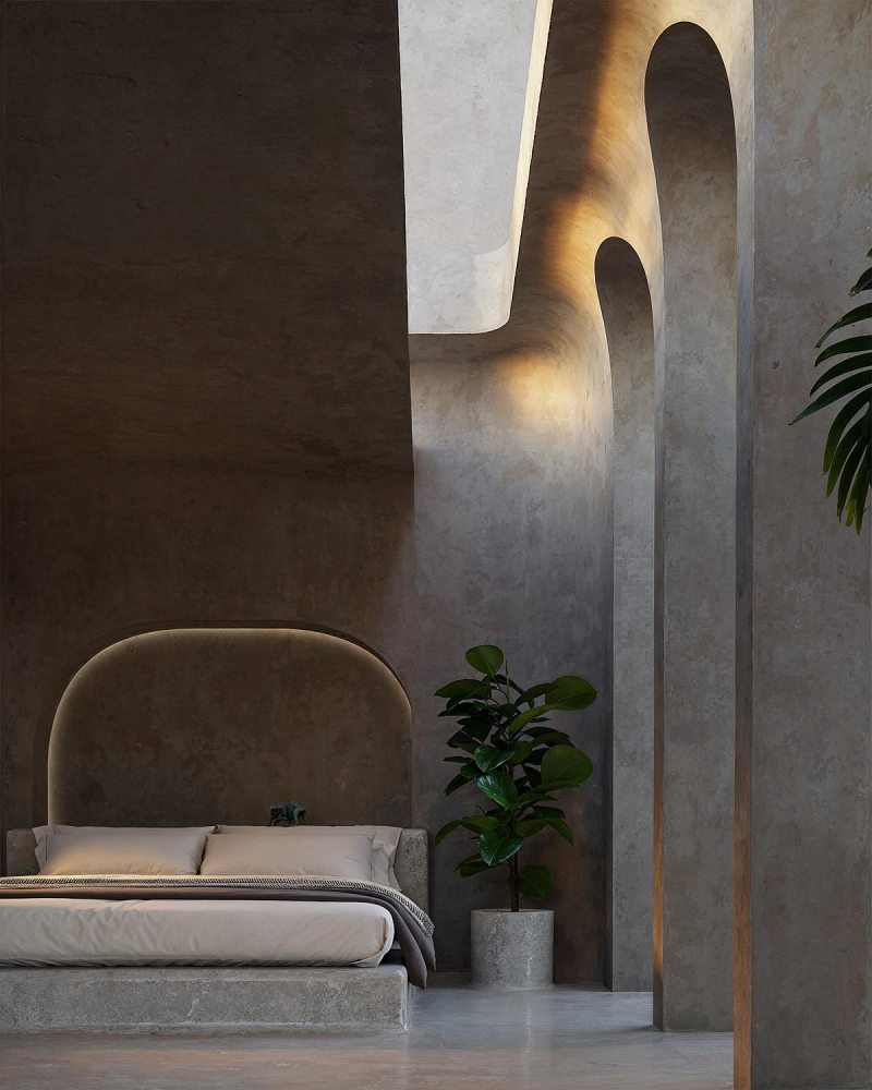 A West Boracay Bungalow, como é conhecida, enfatiza o minimalismo, com todo o volume revestido em pedra de origem local, criando continuidade visual com a geologia da encosta. O pavimento superior aparenta flutuar sobre o desnível natural, sustentado por estruturas ocultas que reforçam a leitura leve do conjunto, mesmo diante da materialidade maciça.