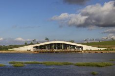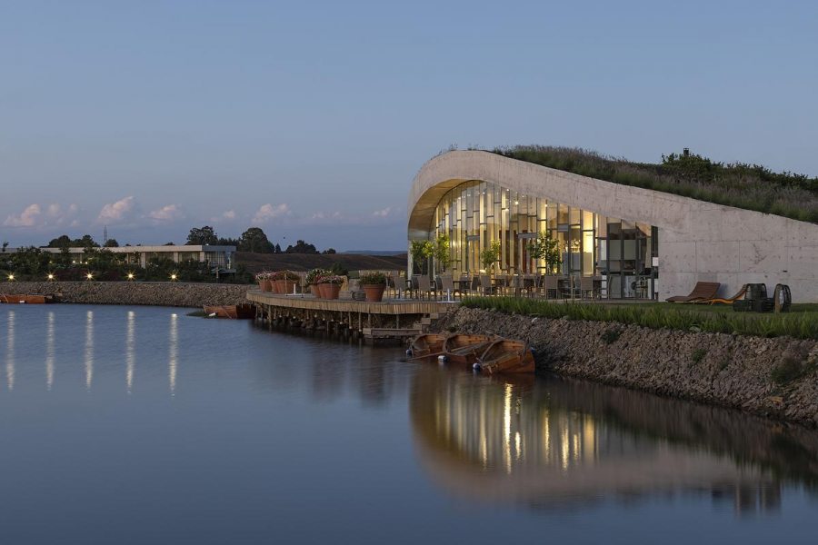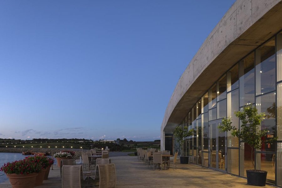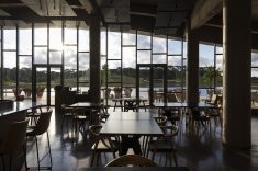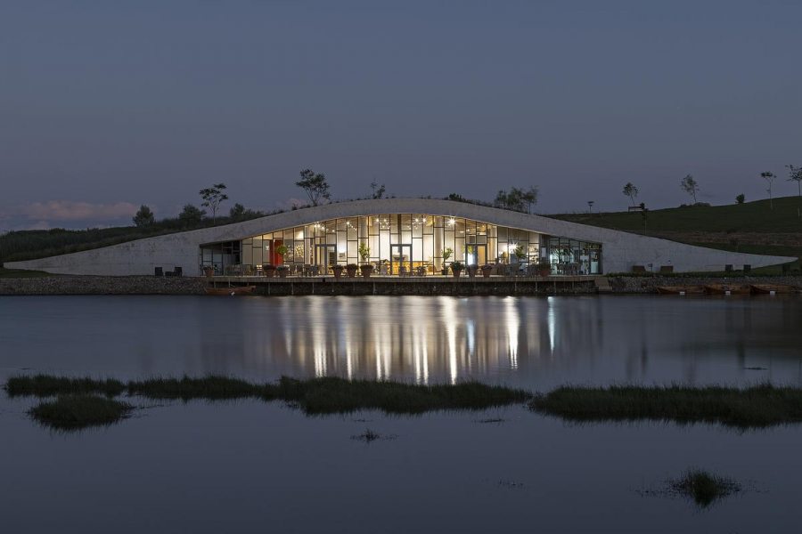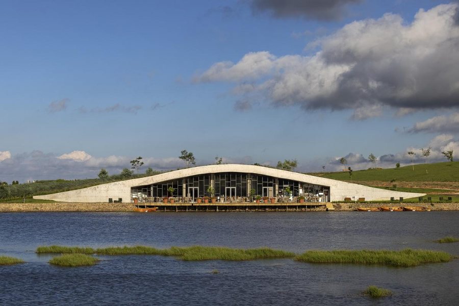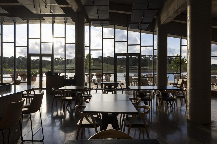 O desenho do edifício favorece o desempenho térmico e a ventilação natural, além de transformar a vista em elemento central da experiência. A abertura para o lago faz com que o exterior participe ativamente do ambiente interno, dissolvendo limites entre dentro e fora e ampliando a sensação de pausa que o projeto propõe.