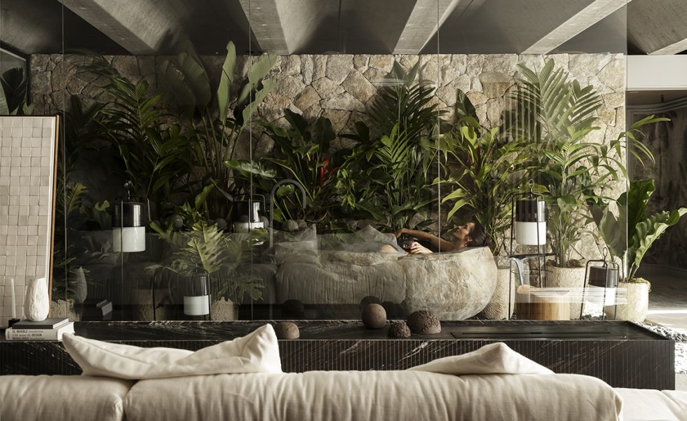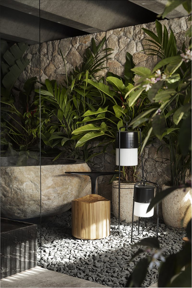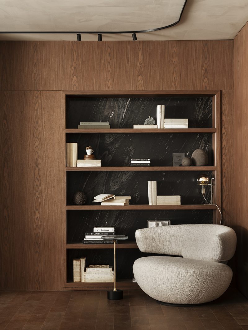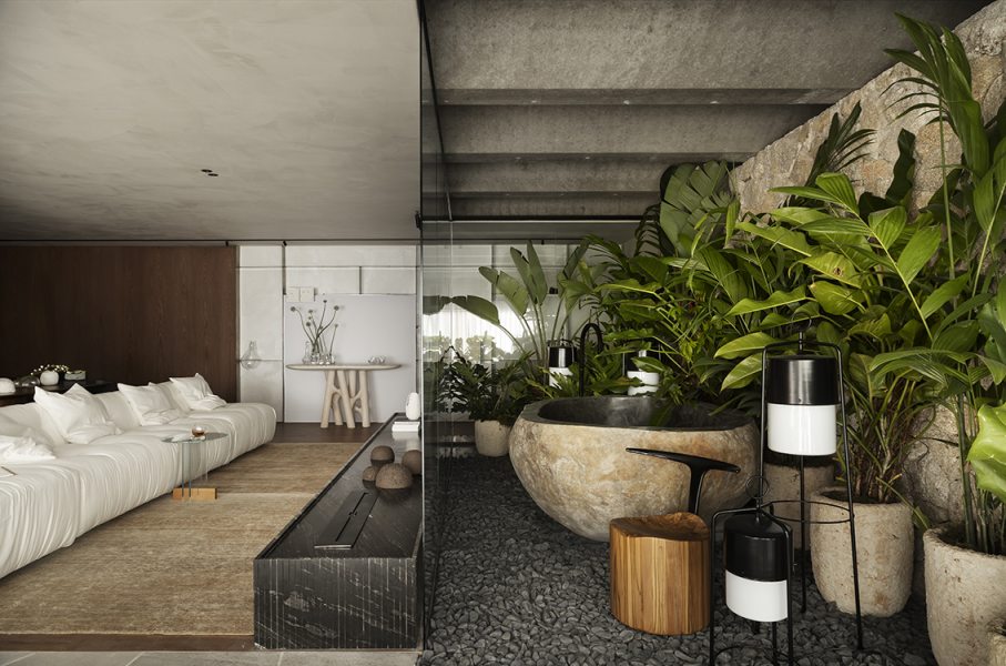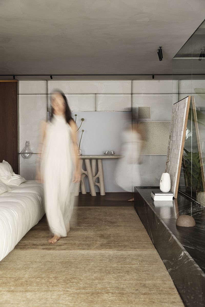 A paleta de materiais traz madeira, pedra e tecidos leves, em diálogo com elementos metálicos pontuais em latão, que ajudam a refletir a luz de maneira discreta. Uma biblioteca compõe o ambiente, inspirada nas memórias afetivas da arquiteta, e reforça o caráter introspectivo e contemplativo do espaço.
