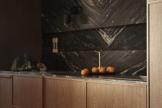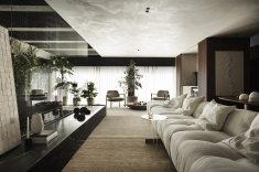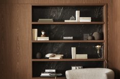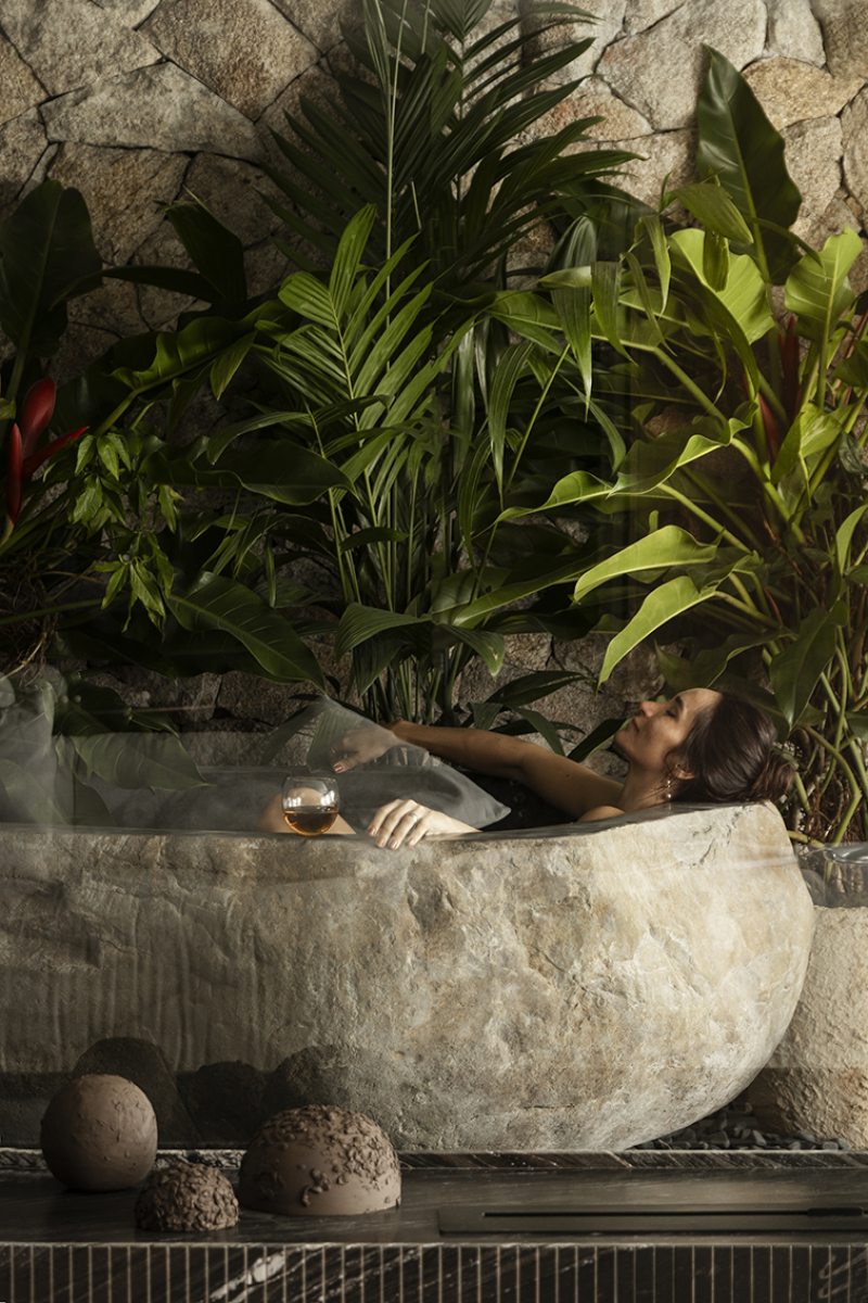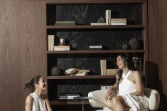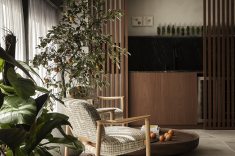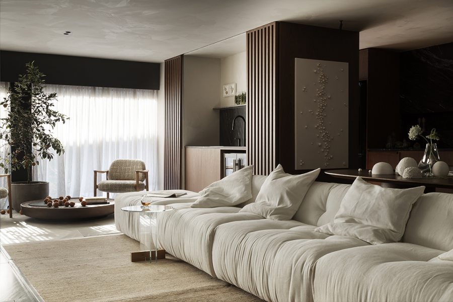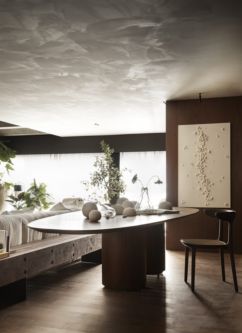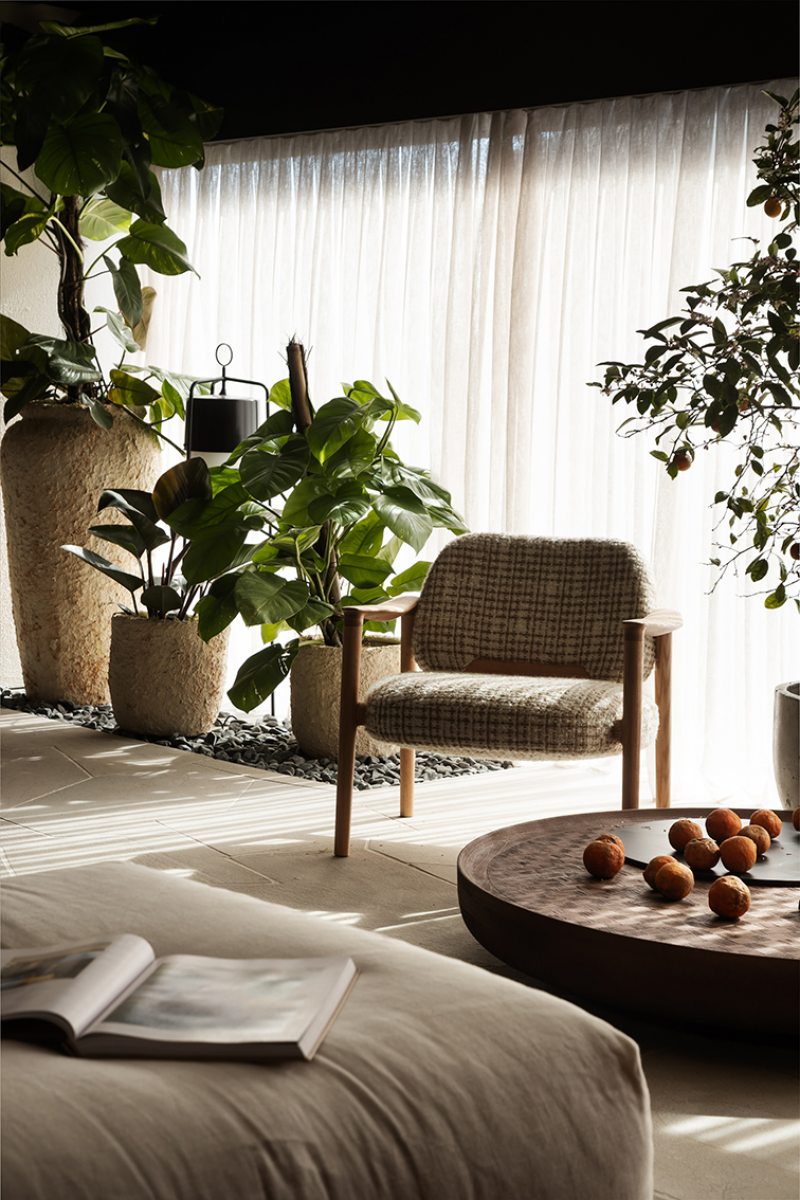A paleta de materiais traz madeira, pedra e tecidos leves, em diálogo com elementos metálicos pontuais em latão, que ajudam a refletir a luz de maneira discreta. Uma biblioteca compõe o ambiente, inspirada nas memórias afetivas da arquiteta, e reforça o caráter introspectivo e contemplativo do espaço.