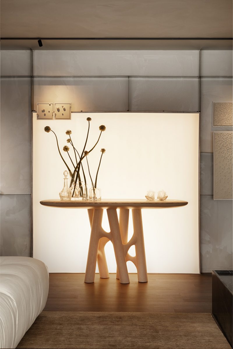Entre os projetos em exibição está o Living Sopro, assinado pela arquiteta Andressa Venturini, que participa pelo segundo ano consecutivo da edição catarinense. O espaço foi pensado a partir da planta real de um futuro empreendimento a ser construído no mesmo local da mostra. A proposta valoriza a integração entre arte e arquitetura de interiores, explorando texturas naturais, superfícies orgânicas e pontos de iluminação estratégica.
