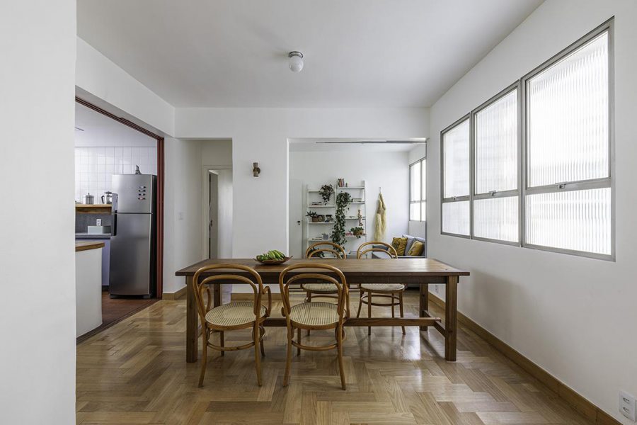 O projeto teve como foco otimizar os ambientes, ampliar a área social e integrar os espaços de forma fluida e reversível. A cozinha, antes isolada, ganhou protagonismo: o antigo banheiro de serviço foi demolido e a lavanderia, compactada. Esse gesto permitiu que a cozinha se abrisse para a sala de jantar, conectando-se aos encontros e rituais cotidianos dos moradores. Uma grande porta de serralheria com vidro canelado foi desenhada para oferecer privacidade quando necessário, mas sem perder luz ou leveza visual.