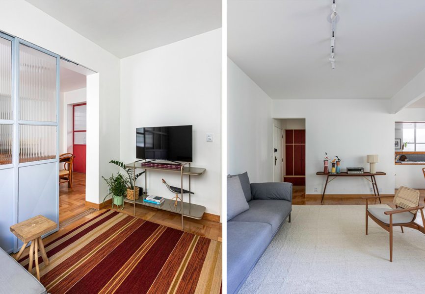 Um dos quartos foi transformado em sala de TV, ampliando a área social e oferecendo versatilidade ao uso do apartamento. Através de uma terceira porta de serralheria com vidro canelado, o espaço pode se converter em quarto de hóspedes com facilidade: um recurso que revela a preocupação com a multifuncionalidade, sem perder o caráter visual coeso do conjunto.