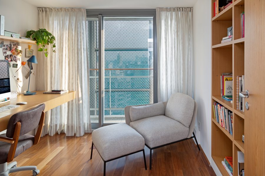 Nesse projeto do Estúdio Cipó com o arquiteto Danilo Hideki, a mesa foi reaproveitada do jovem casal de moradores. Além disso, os armários são móveis flexíveis, caso eles queiram transformar o ambiente em um quarto de bebê no futuro. Para controlar a rica iluminação natural, um tecido delicado foi escolhido para as cortinas. Pensando na organização, a estante de nichos, também em madeira de cor clara, foi projetada para receber livros e documentos.