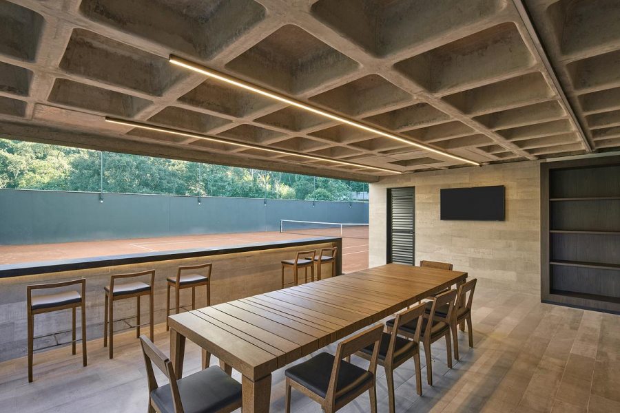 A implantação reforça essa vocação. Todas as unidades são posicionadas para aproveitar ao máximo a paisagem montanhosa, e a fachada curva abre o campo visual conforme o morador se desloca pelos ambientes. O resultado é uma experiência de moradia que se desenrola em camadas — ora horizontalmente, ora verticalmente — sempre conectada à vista e ao ciclo solar. Mezaninos, terraços, janelas profundas e vazios internos não funcionam como adições isoladas, mas como parte de uma estratégia arquitetônica que busca ampliar a vida cotidiana.