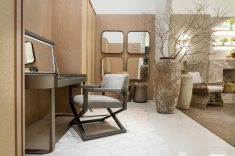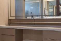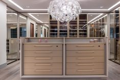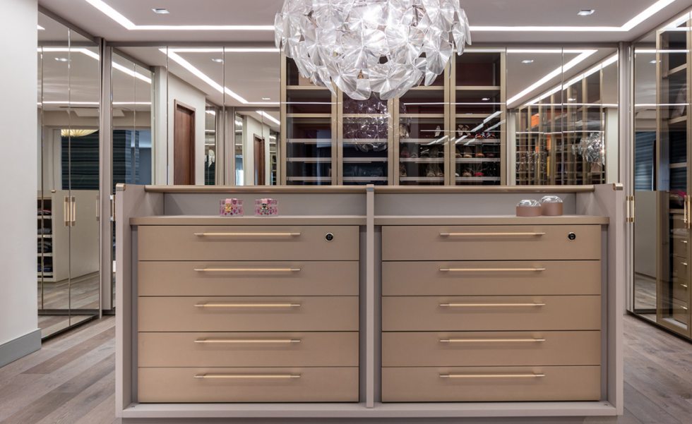 Neste closet, Ana Andrade utiliza mocha mousse nos acabamentos dos armários e metais em tons dourados ou bronze.